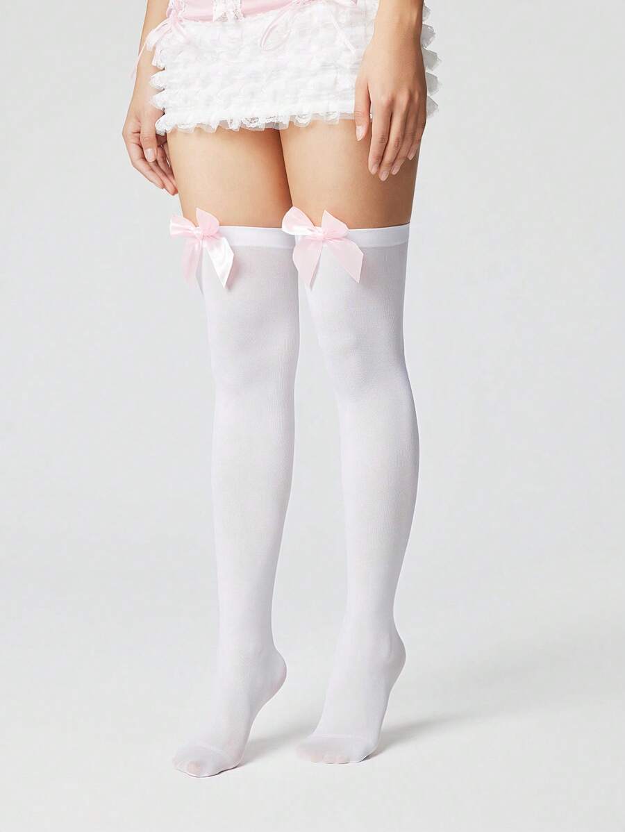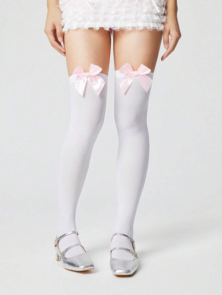 Kawaii 1 Pair Women Bow Decor White Nylon Over-The-Knee Socks, Sweet Pink, All Season