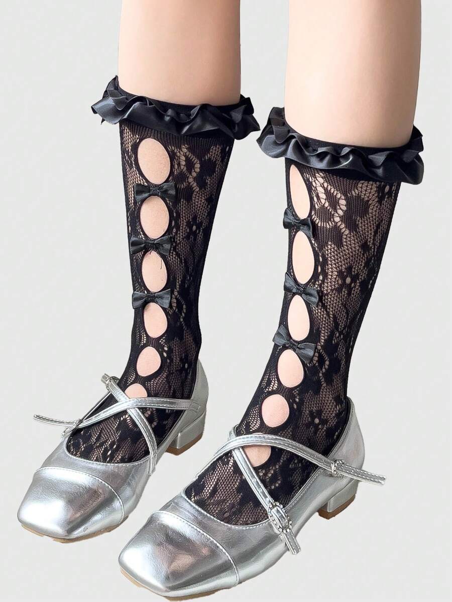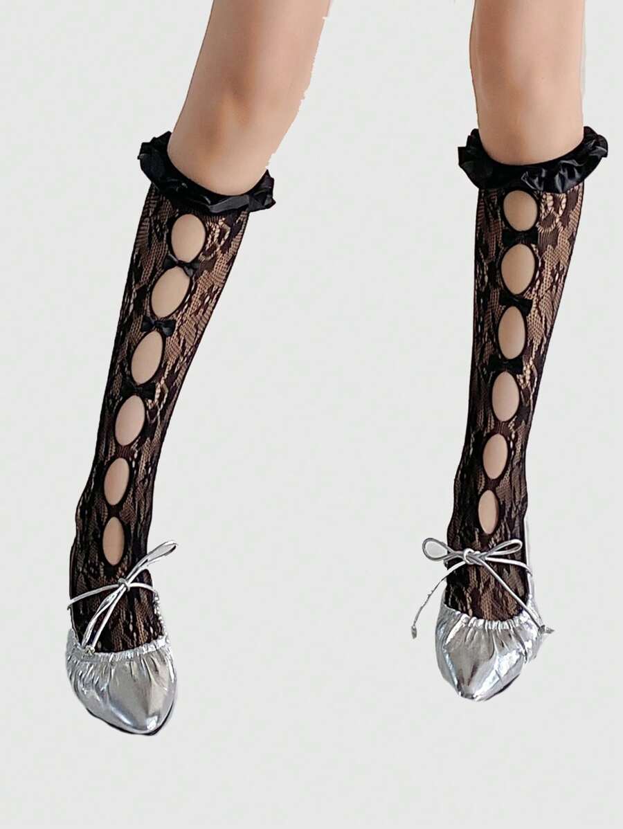 Kawaii 1 Pair Women's Cute Lolita Black Hollow Bowknot Fishnet Mid-Calf Socks