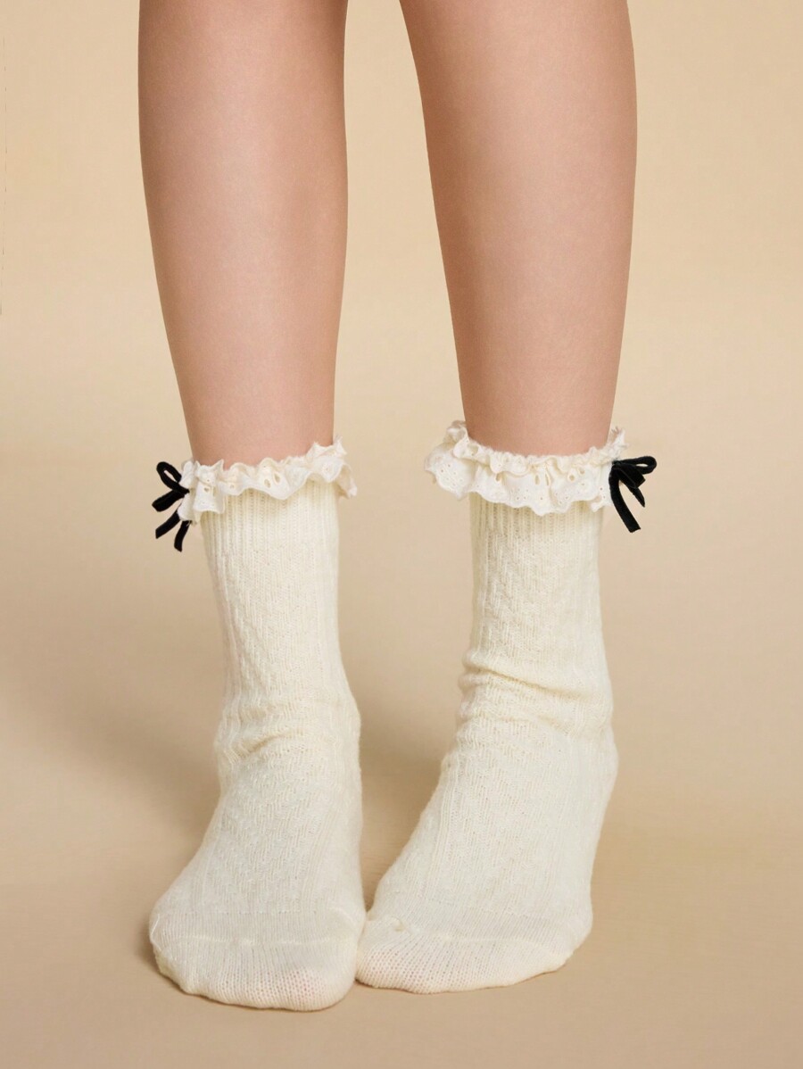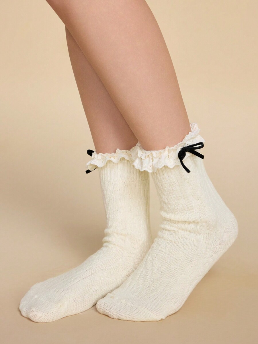 Kawaii 1 Pair Women's Vanilla Girl Embroidered Lace Bow Thickened Knitted Mid-Calf Socks, All Season