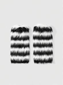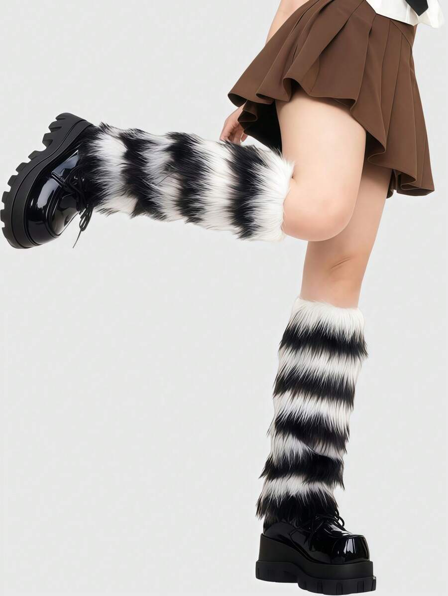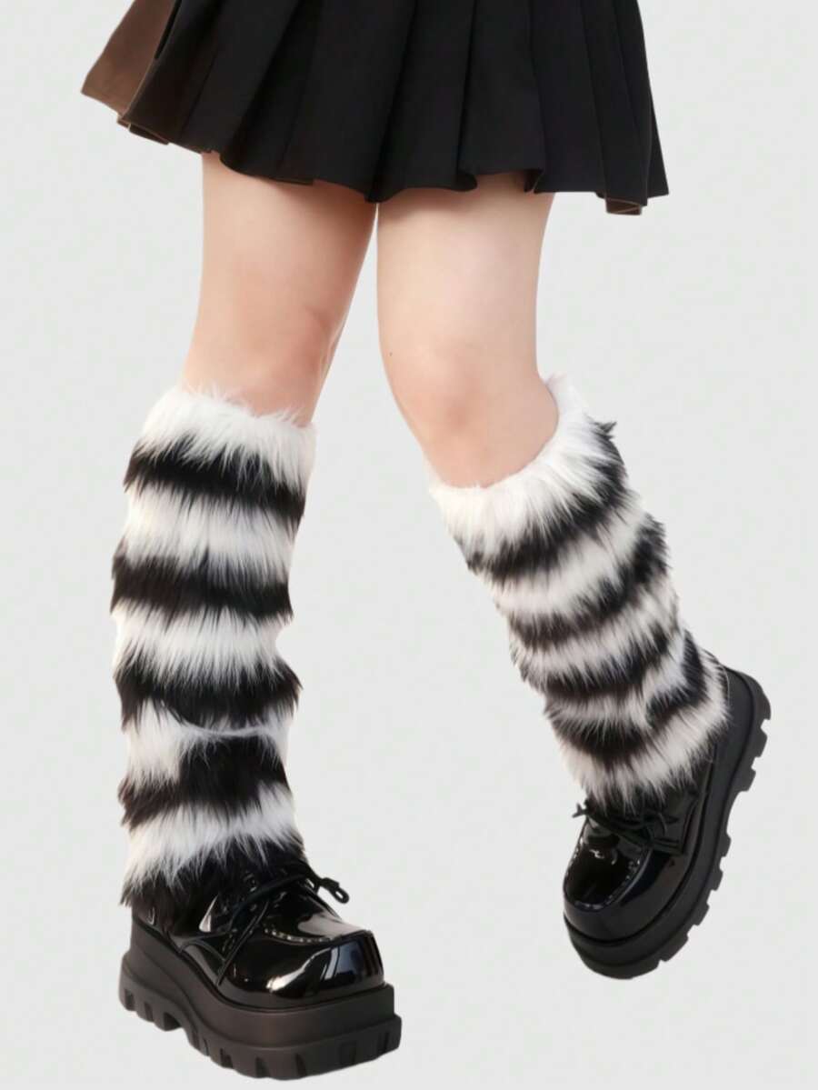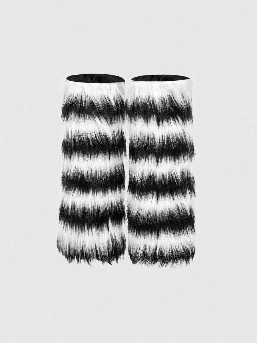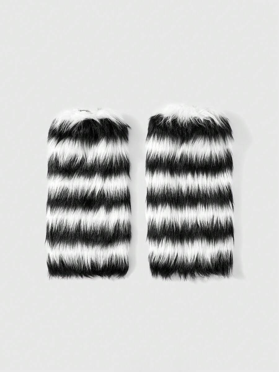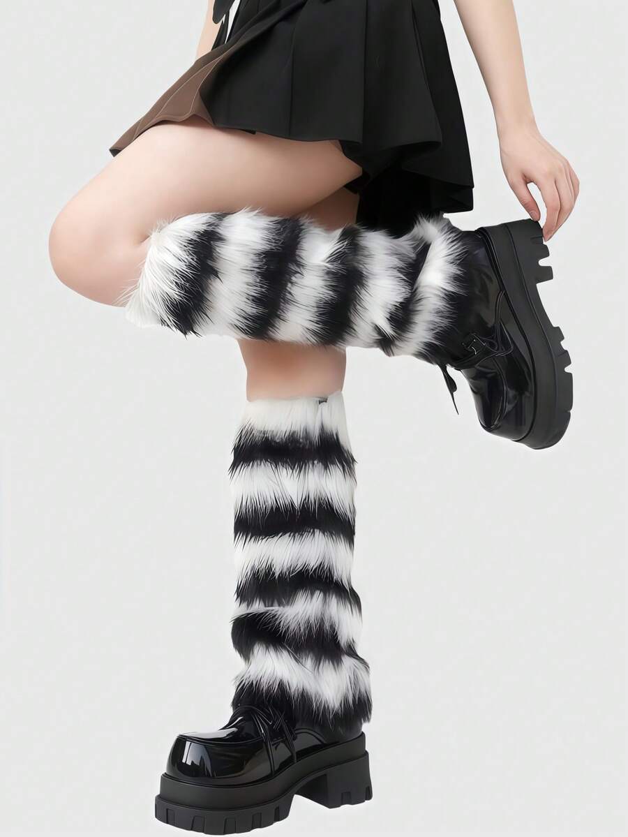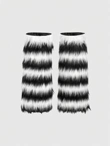 Kawaii 1 Pair Y2K Striped Fuzzy Leg Warmers, Black & White, Fashionable Minimalist Edgy Design For Women, Suitable For Daily Wear, Parties, Dates, Shopping And More
