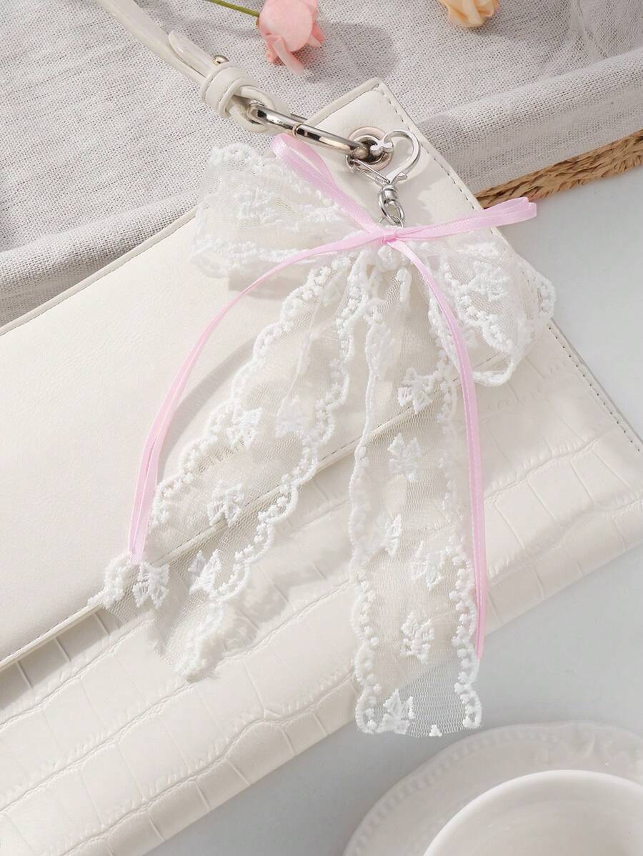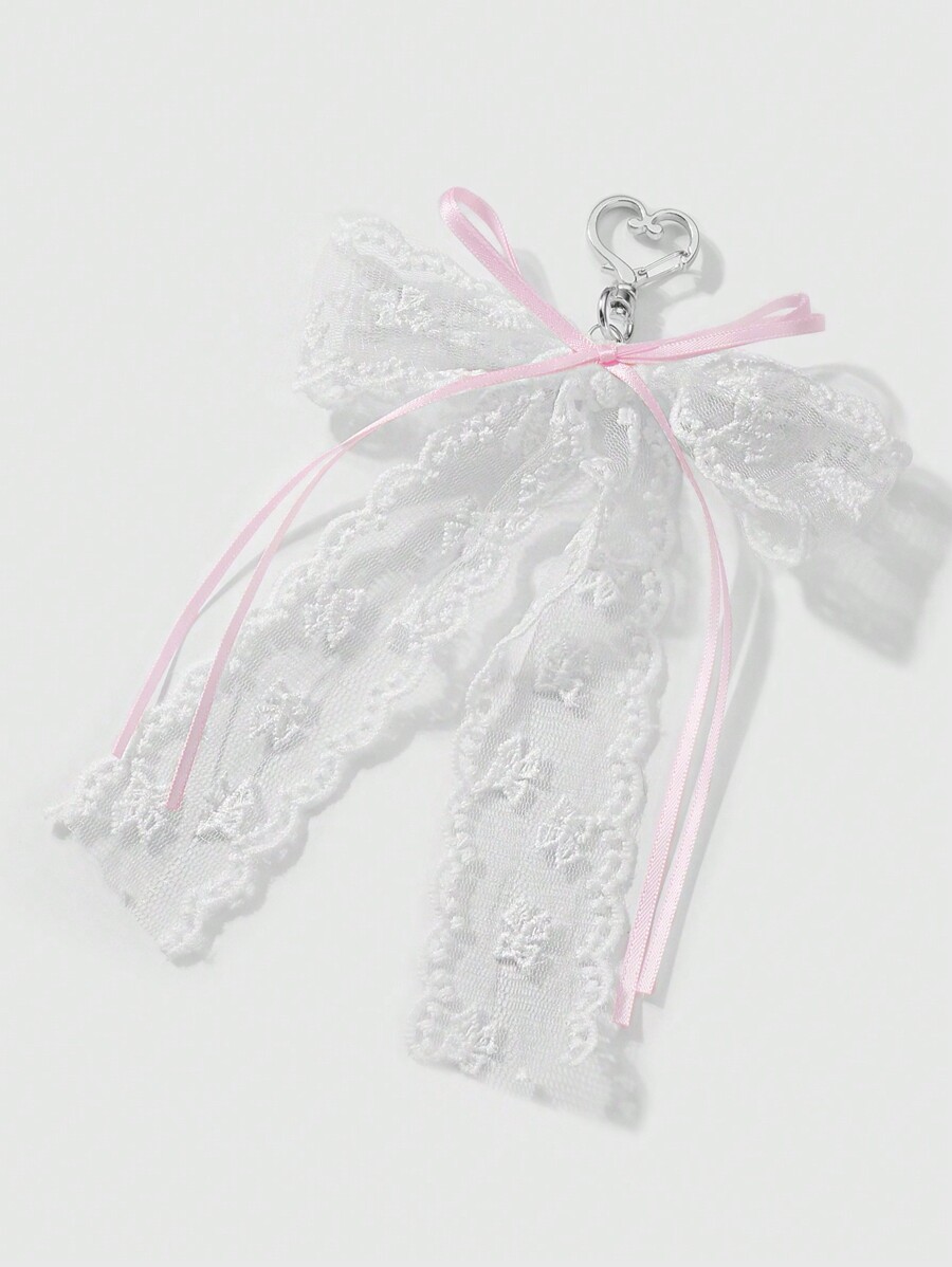 Kawaii 1 Pc Ins Korean Style Simple Casual Fashion College Style Light Pink Ribbon White Mesh Embroidery Lace Double Bowknot Heart Keychain Bag Accessory, Suitable For Women/Girls, Daily Wear & Gift