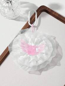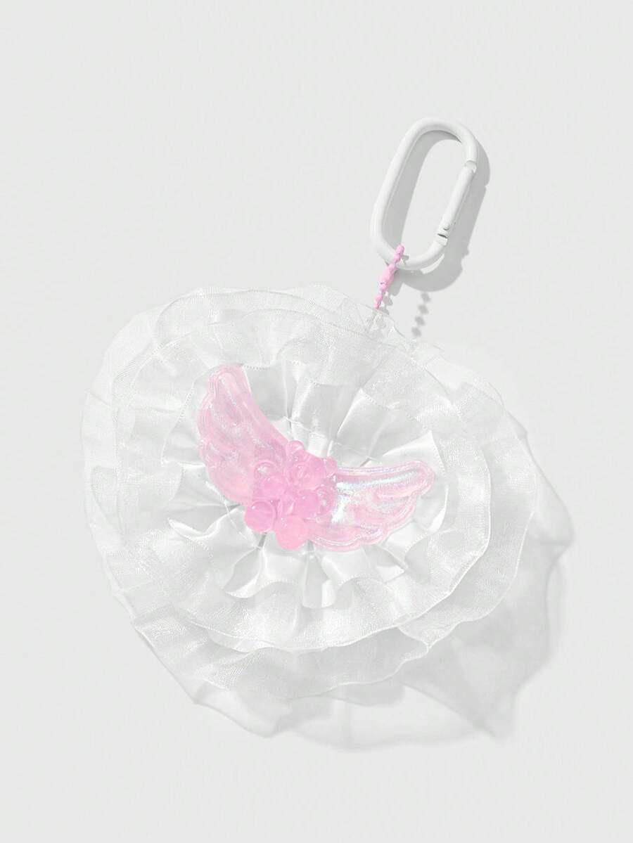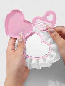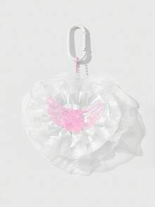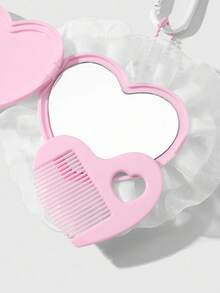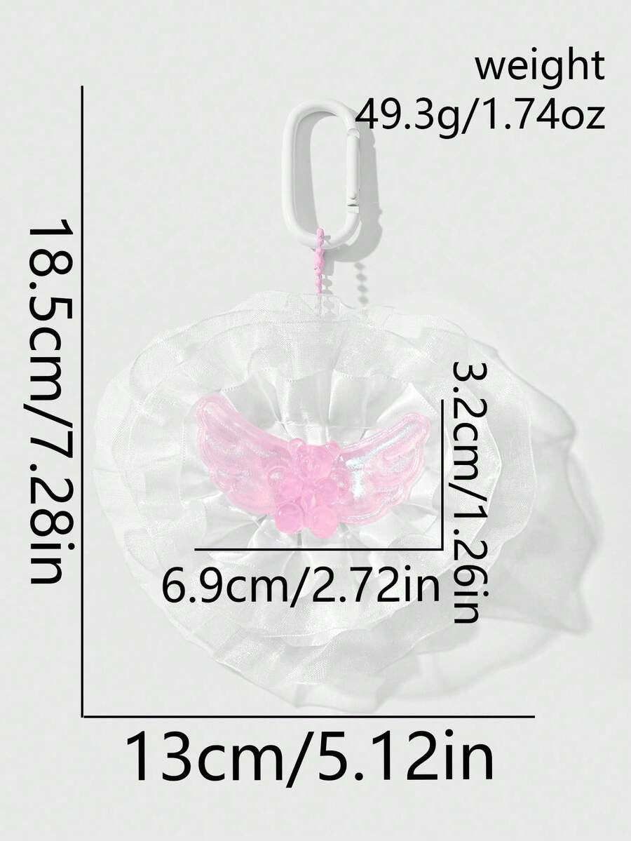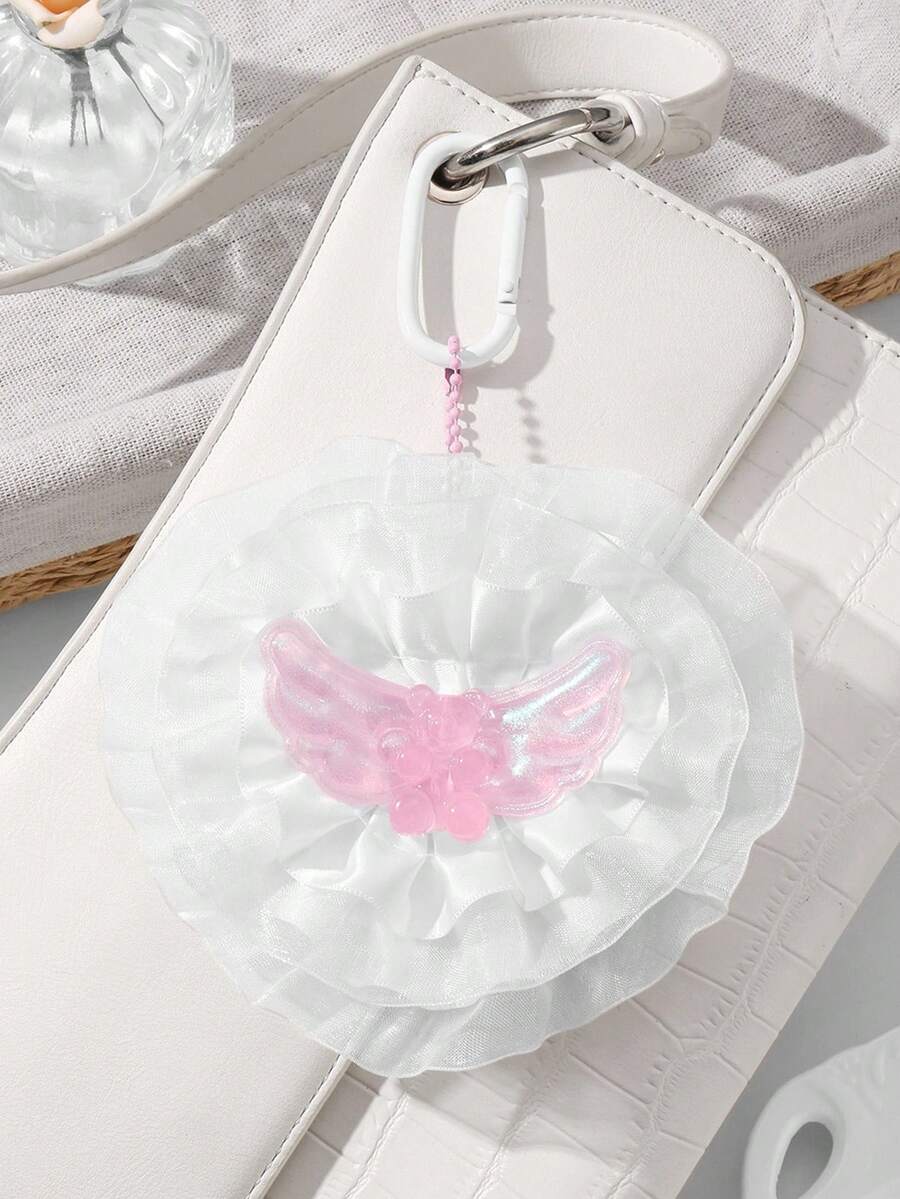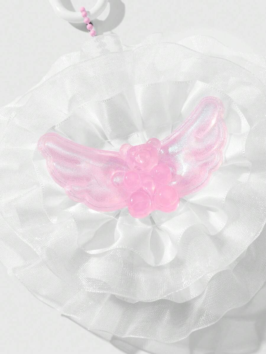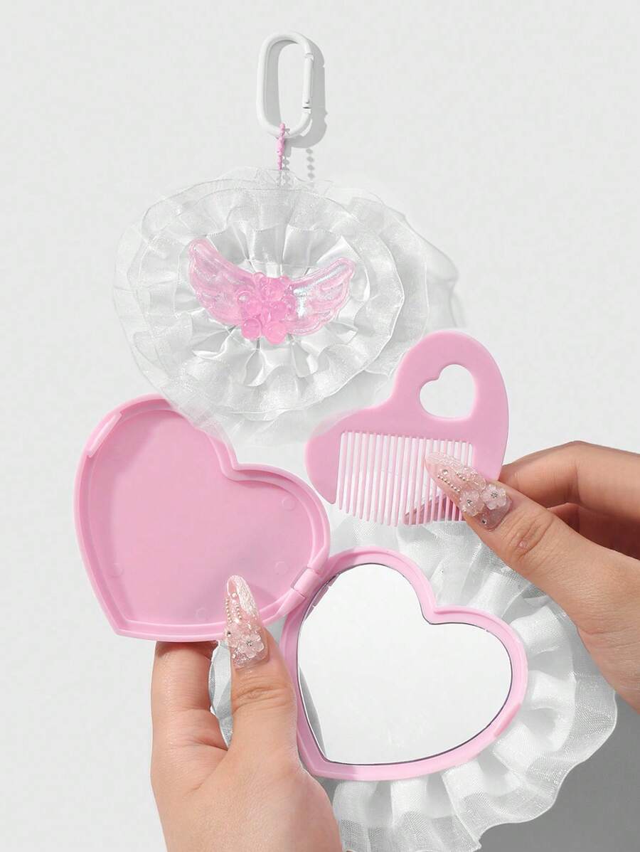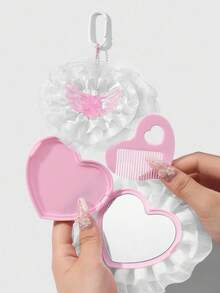 Kawaii 1 Piece Cute Cartoon Acrylic Compact Double-Sided Mirror And Comb Set, Delicate White Mesh Ribbon, Pink Resin Glitter Winged Bear Decor, Versatile Mini Heart-Shaped Glass Mirror, Keychain & Bag Charm Gift Set For Women