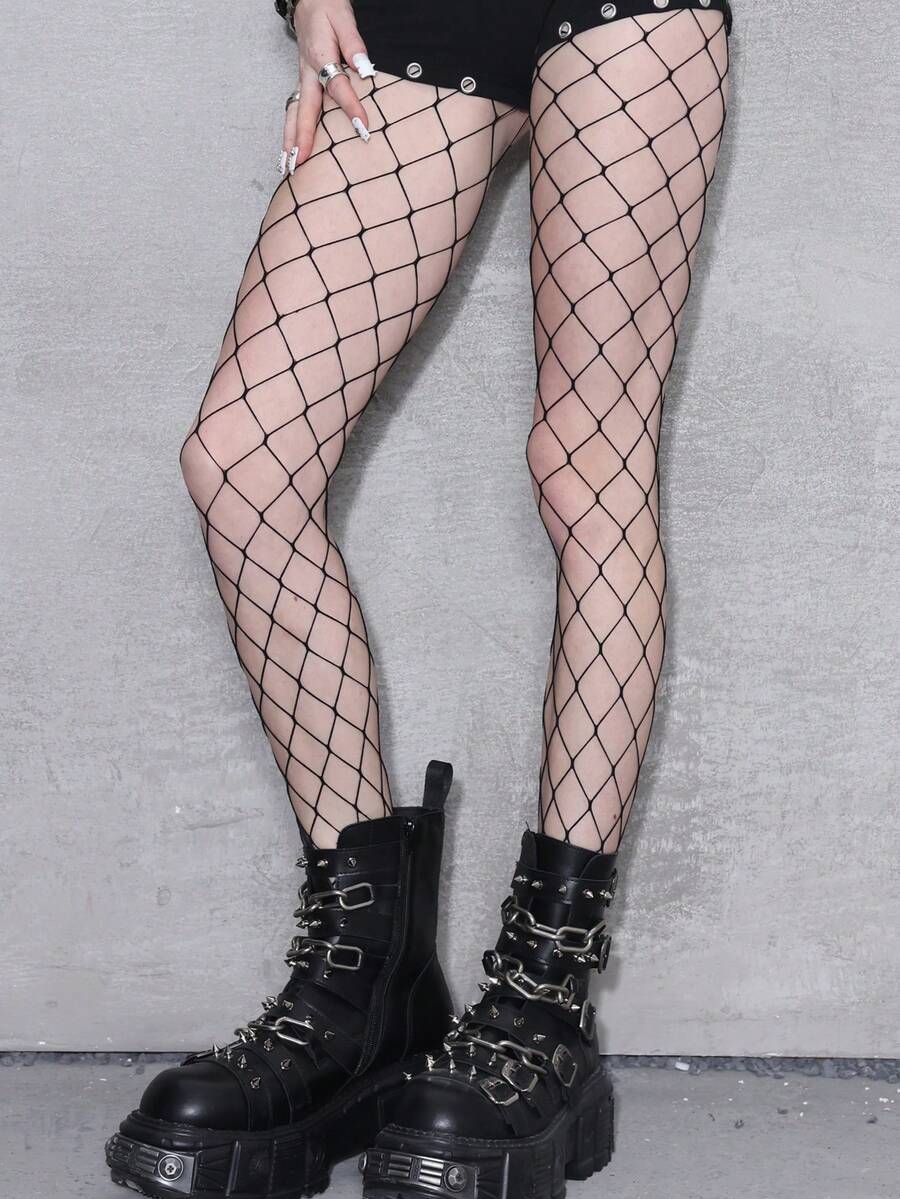 Kawaii 1 Piece Minimalist Mesh Socks, Sexy Hollow Checkered Tights, Punk Style Elastic Pantyhose, Suitable For Dating, Daily Wear