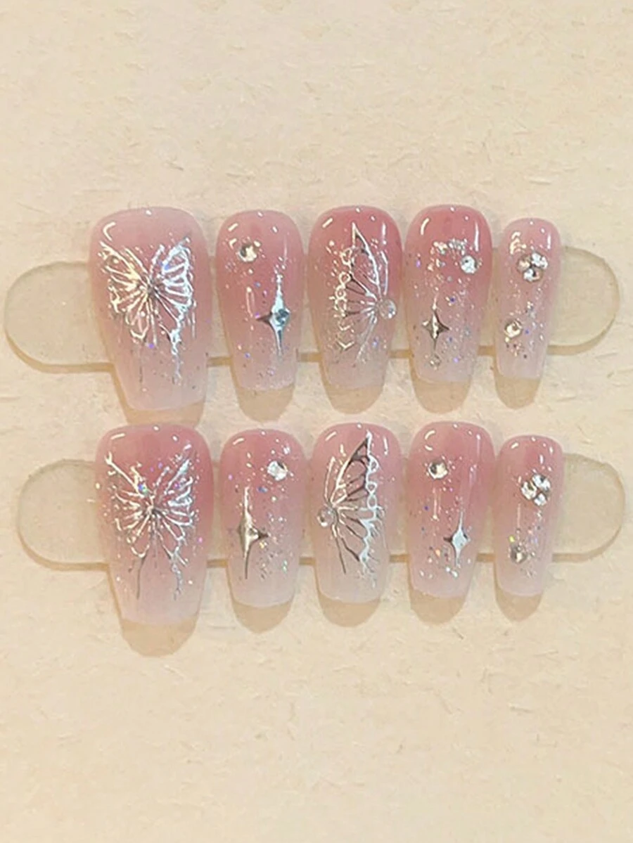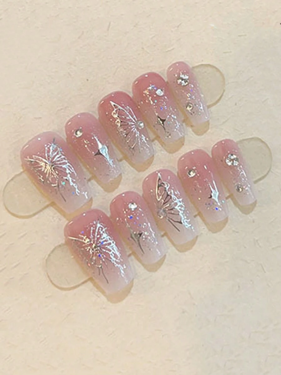 Kawaii 10pcs Butterfly Shaped Diy False Nails And 1pc Adhesive Tape