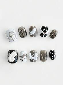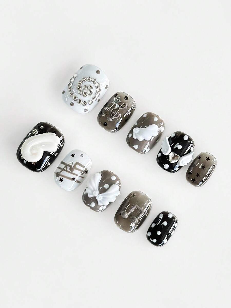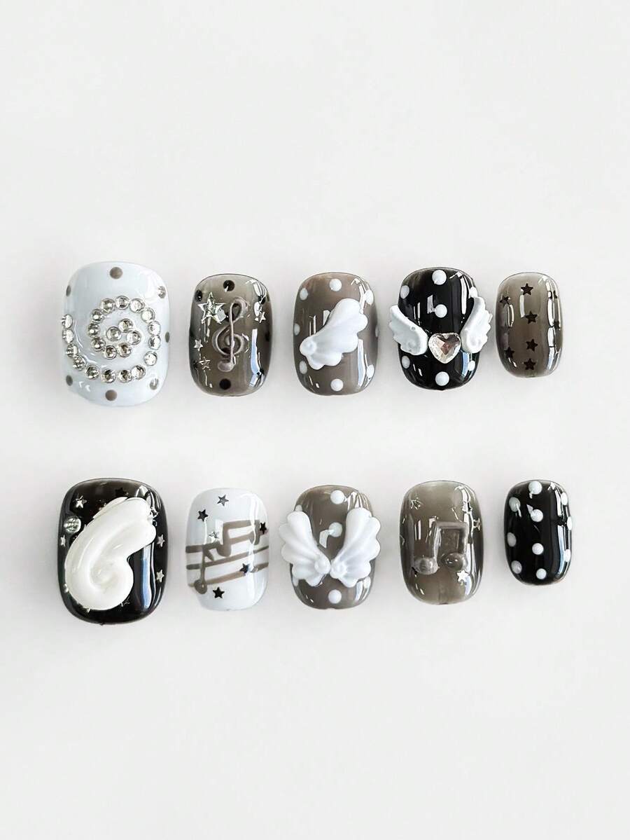 Kawaii 10pcs Cute Wing, Music Note, Star Element Handmade False Nails + 3pcs Double-Sided Adhesive, Detachable Geometric Pattern, Spiral Circle, Polka Dot Nail Art Stickers, High-Quality Rhinestone Shiny Colored Nail Decals, Suitable For Holidays, Parties, Dancing And Daily Wear