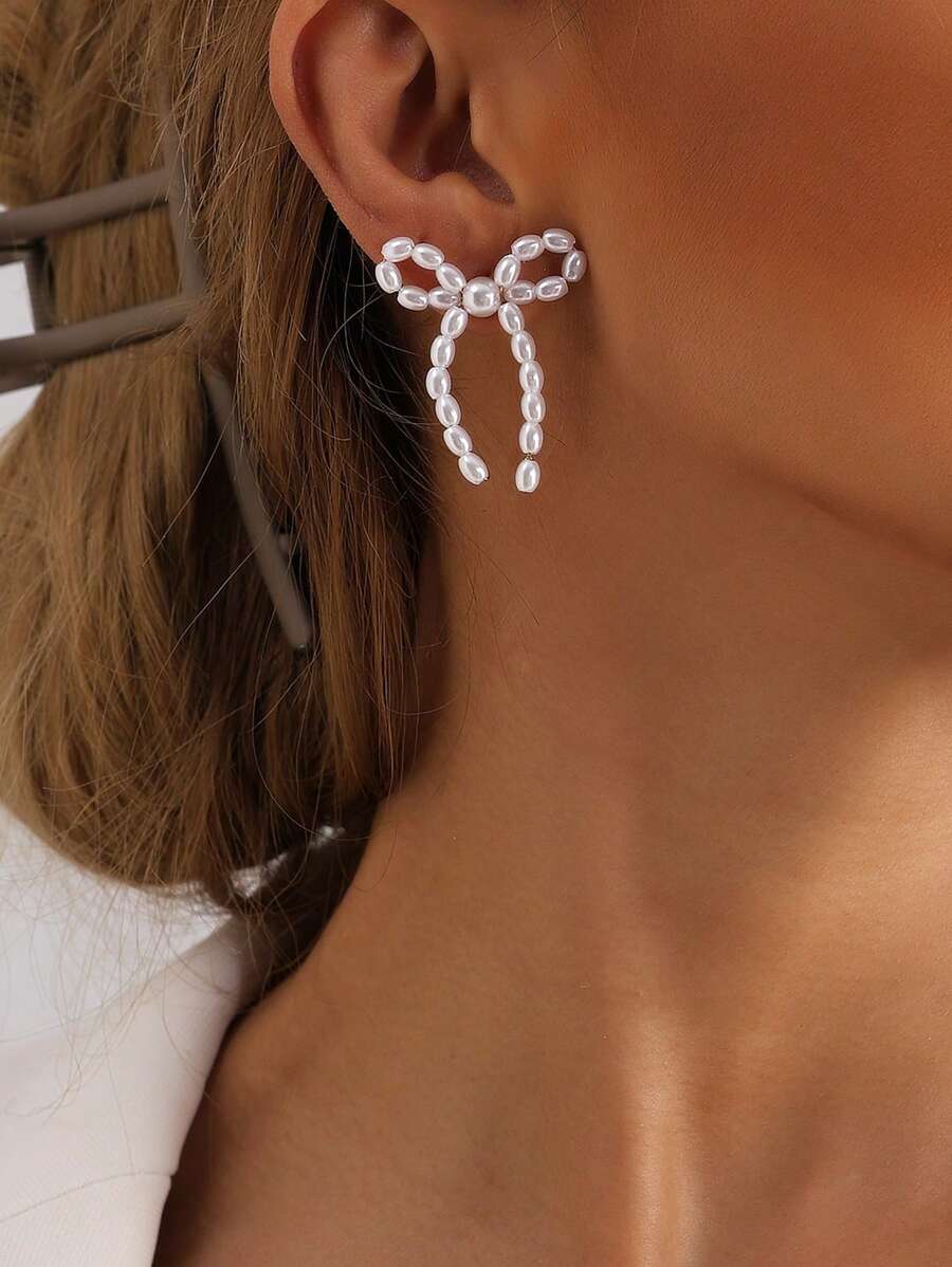 Kawaii 1pair Elegant Faux Pearl Bow Design Stud Earrings For Women For Dating Gift