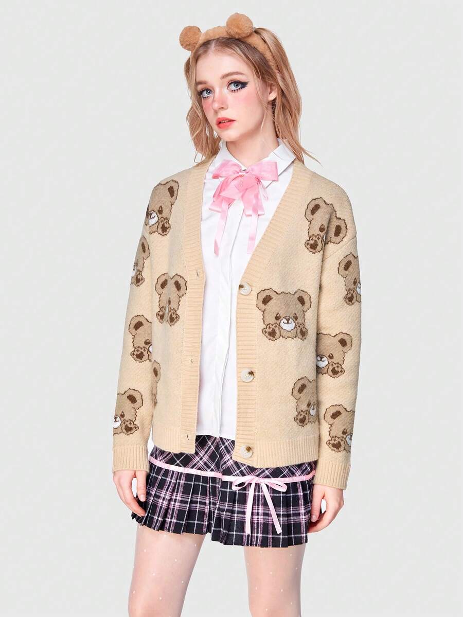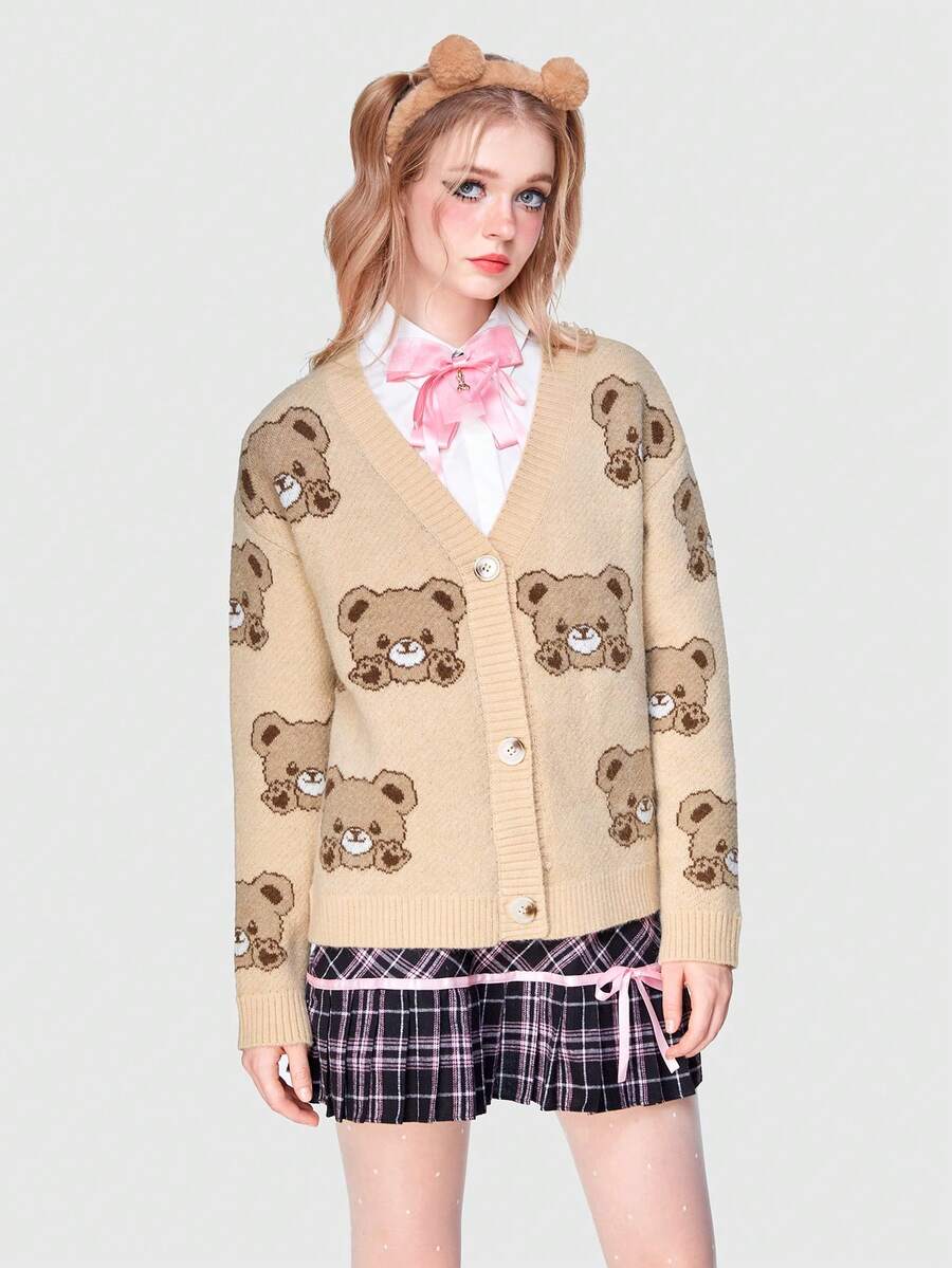 Kawaii 1pc Bear Pattern Drop Shoulder Cardigan