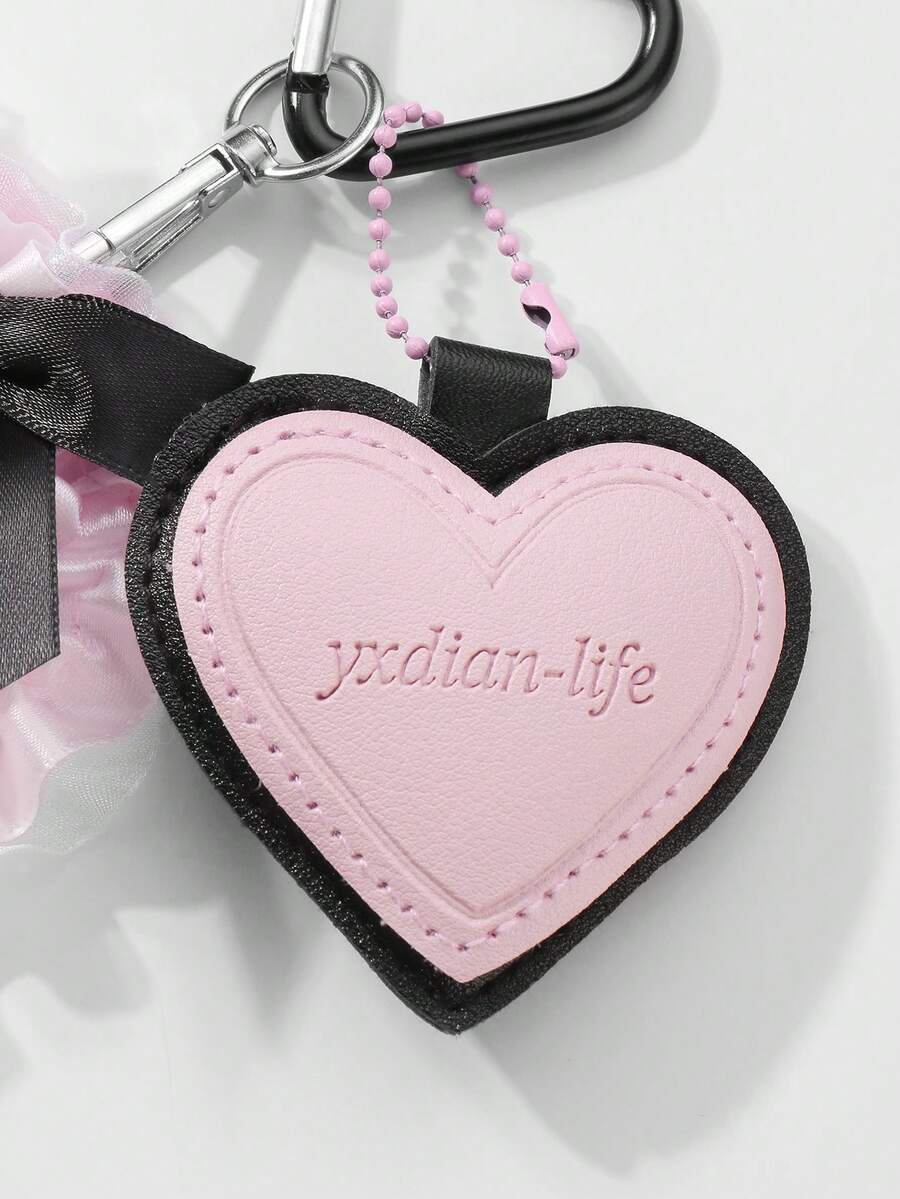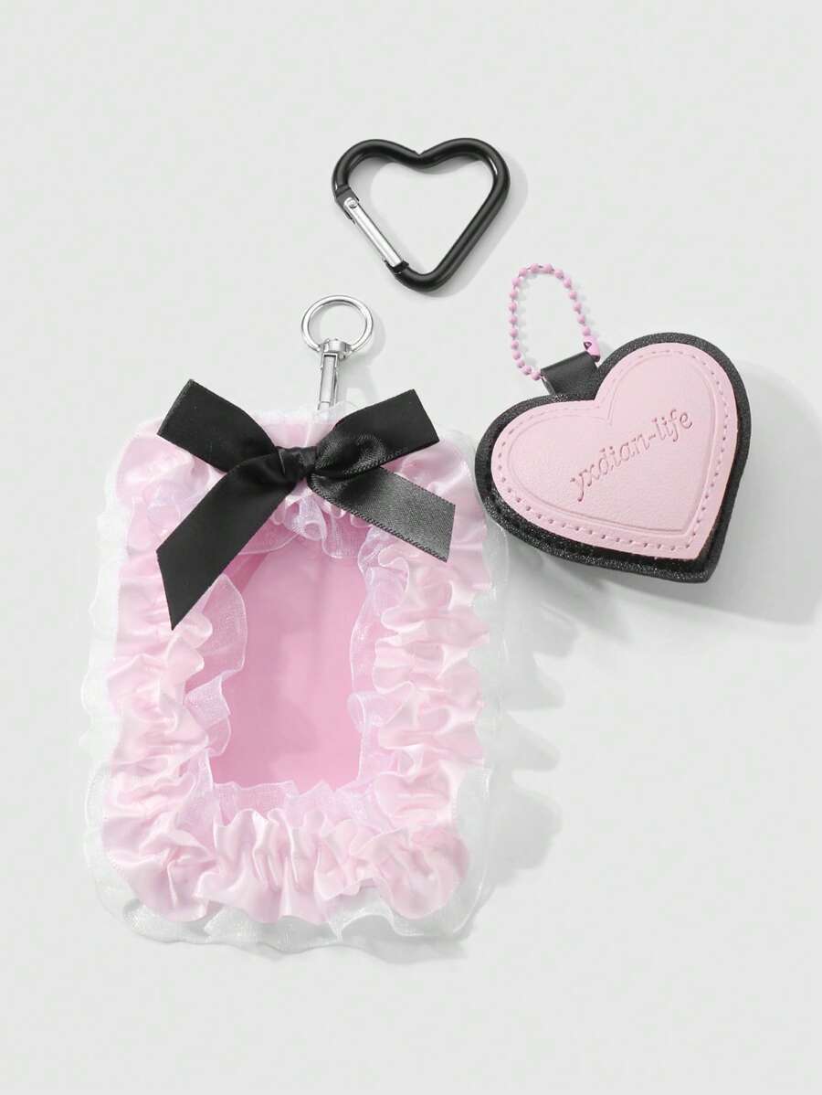 Kawaii 1pc , Cute And Elegant Pink Leather Heart Lace Organza Bow Card Holder, Suitable For Office Workers, Students, Everyday Wear, Ideal For Holiday Gifts