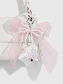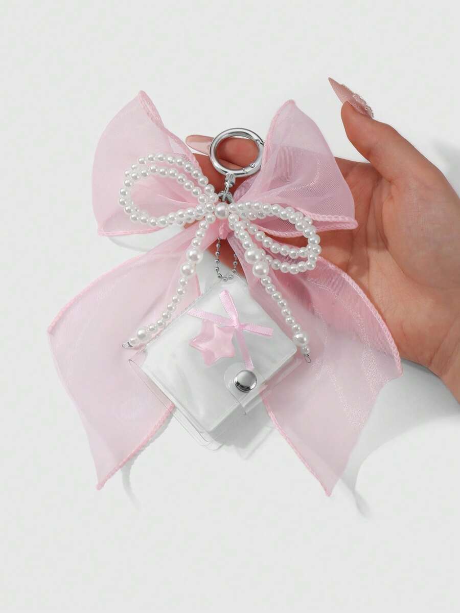 Kawaii 1pc Delicate Handmade Beaded White Faux Pearl, Pink Mesh Ribbon Bow, Sparkling Star Transparent Openable Book/Photo Album Pendant Keychain Bag Charm, Suitable For Women/Girls Daily Wear, Holiday Gift
