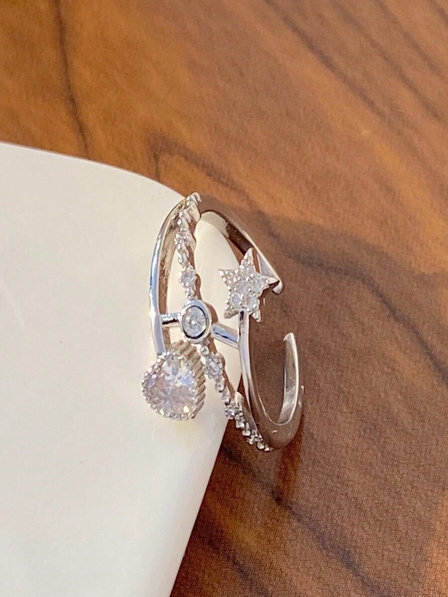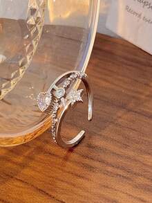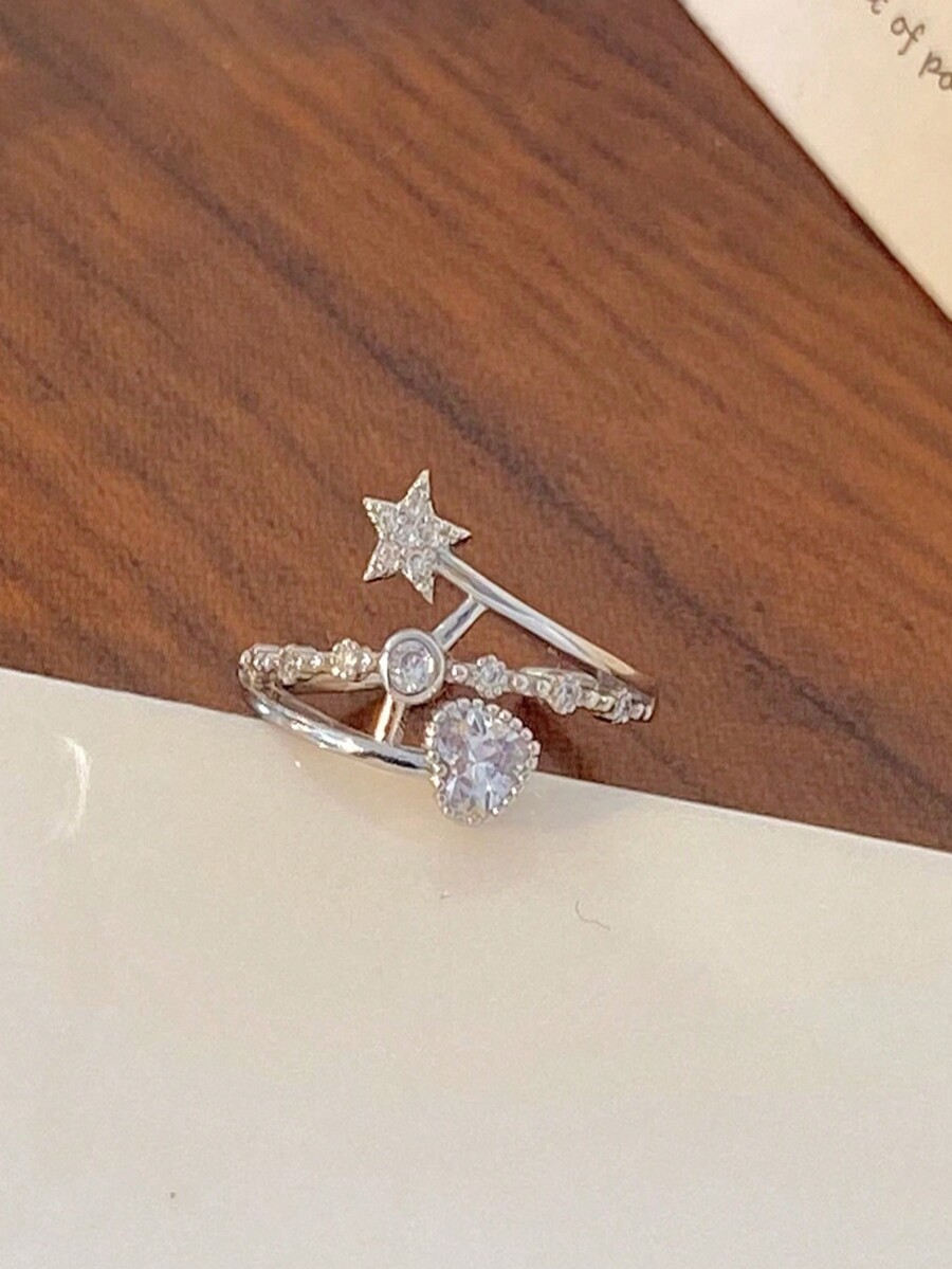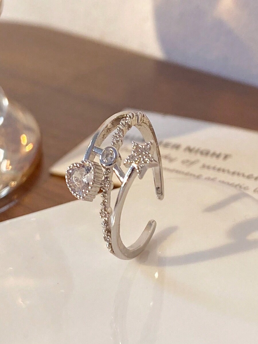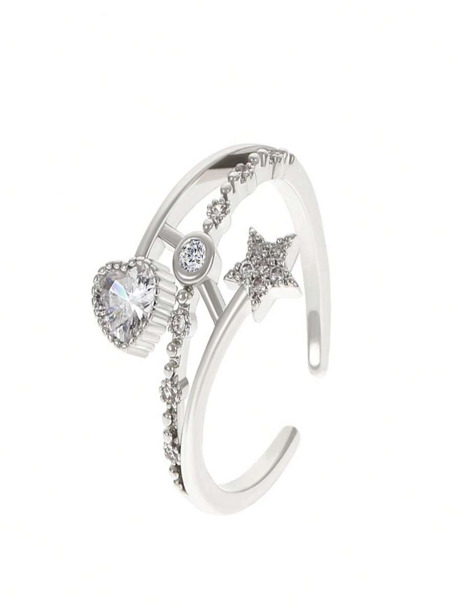 Kawaii 1pc Fashion Copper Star & Heart Cubic Zirconia Decor Cuff Ring For Women For Dating Gift