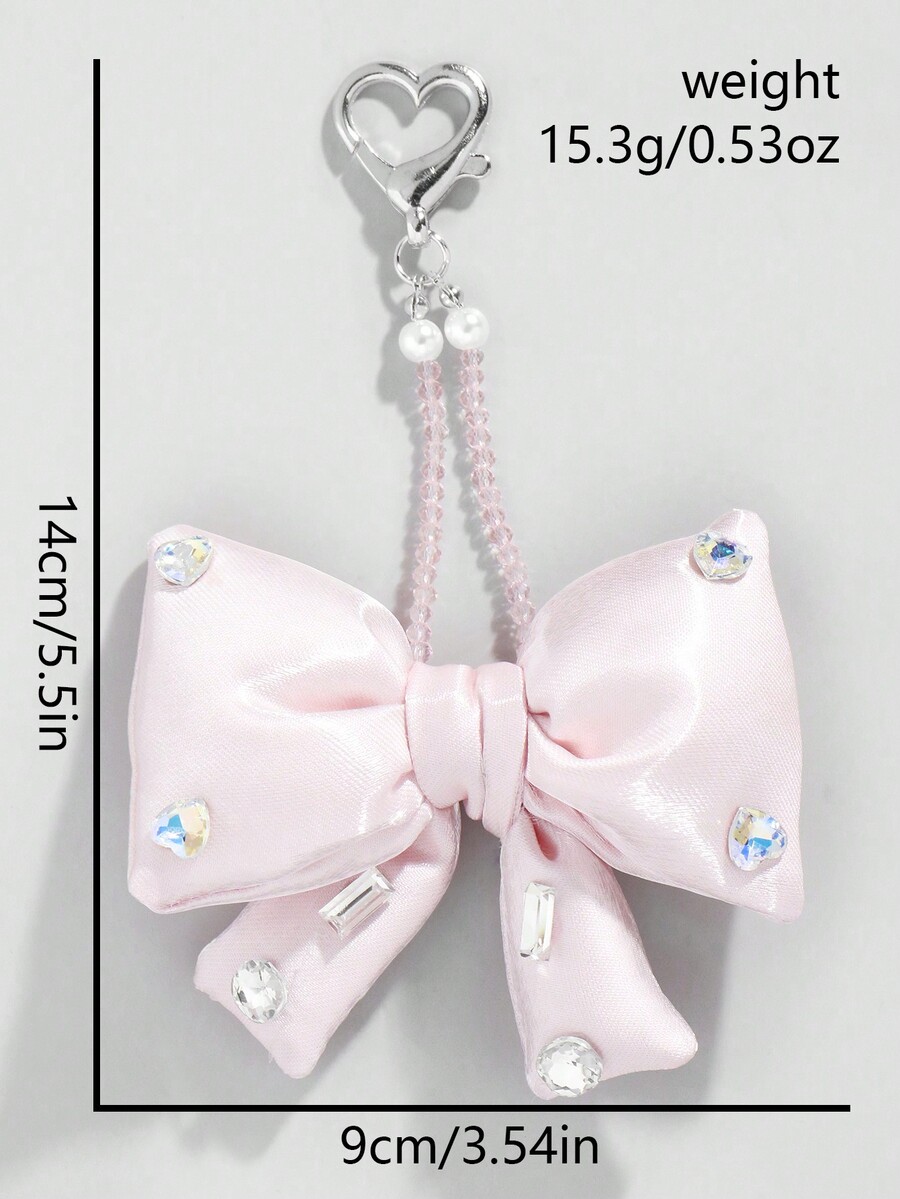 Kawaii 1pc Handcrafted Beaded Pink Faux Crystal Pearl Bow Heart Diamond Shape Rhinestone Charm Keychain, Fashionable Accessory For Women Valentines