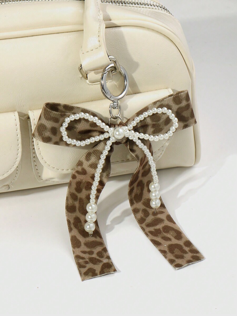 Kawaii 1pc Handmade Beaded, Faux Pearl, Leopard Print Ribbon Bow Keychain, Fashion Accessory, Suitable For Girls, Ideal For Daily Wear And Gifts