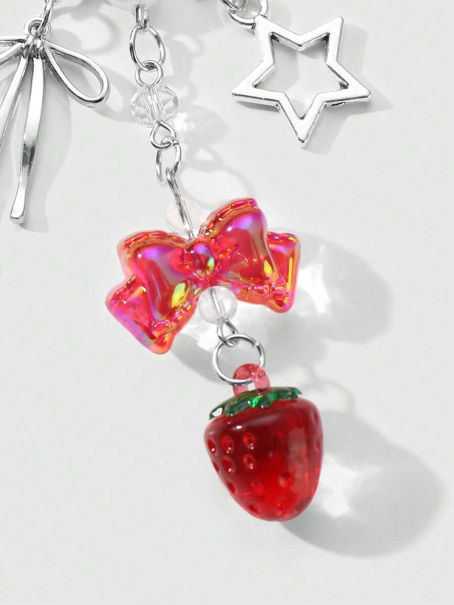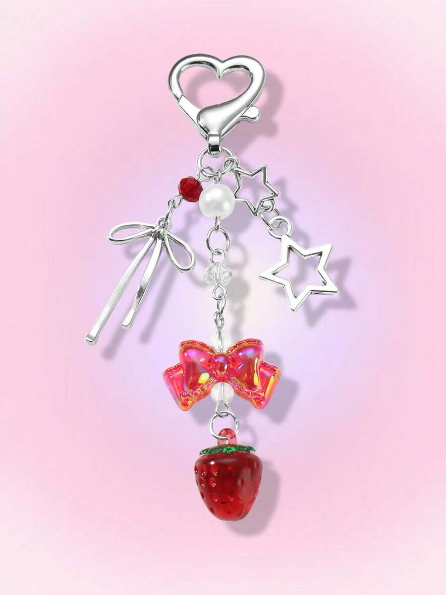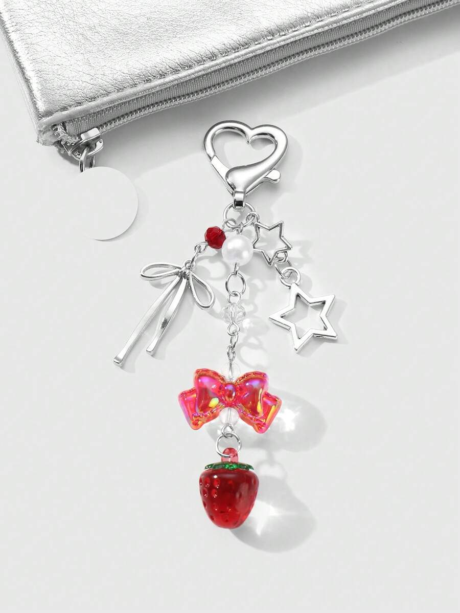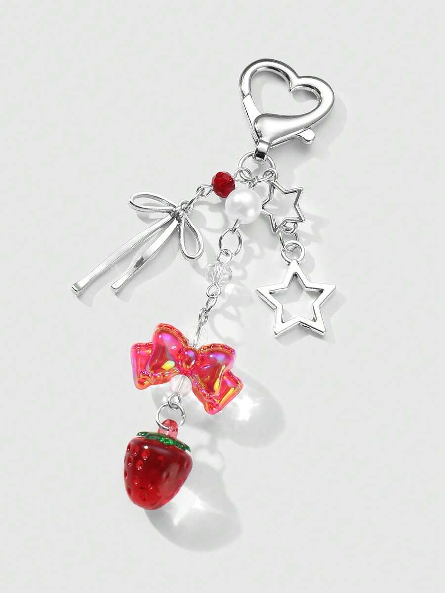 Kawaii 1pc INS Style Elegant Versatile Silver Chain Faux Pearl Star & Bow Knot, Resin Strawberry Charm, DIY Keychain & Bag Pendant, Suitable For Women And Girls, Daily Wear Or Holiday Gift