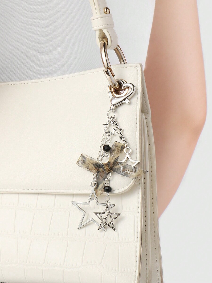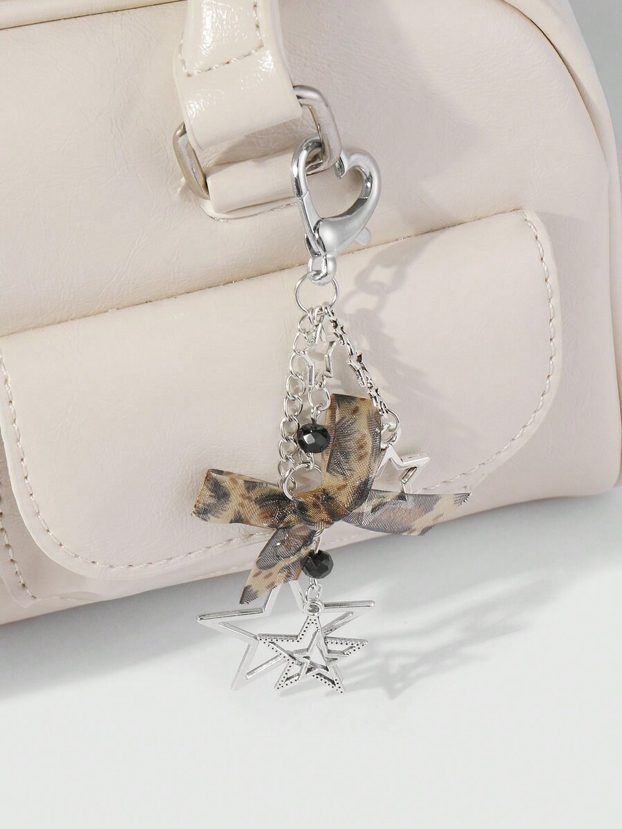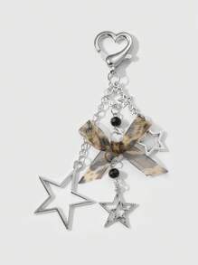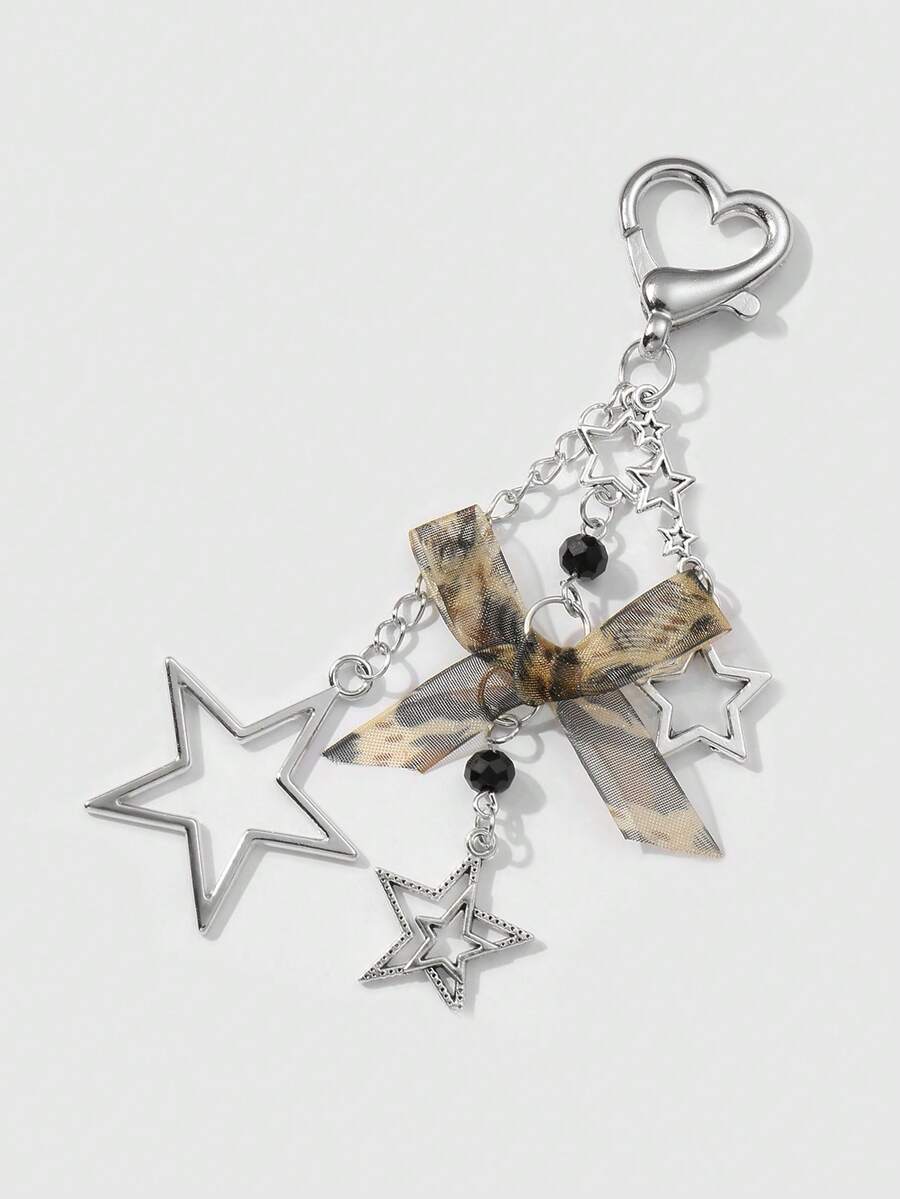 Kawaii 1pc Ins Style Minimalist Silver Hollow Star Chain, Leopard Print Lace Bow & Heart Shaped Keychain, Versatile Accessory For Women, Perfect For Daily Wear And Gift