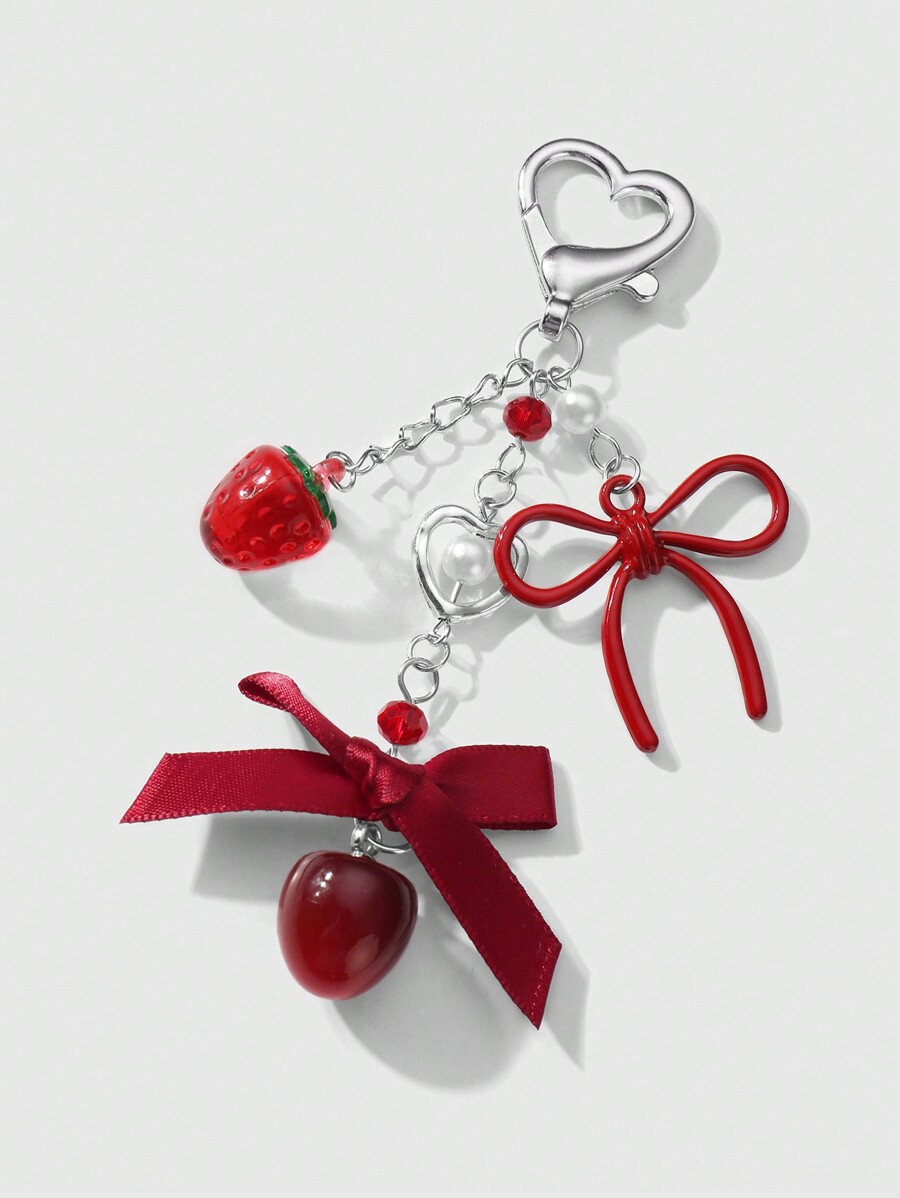 Kawaii 1pc Korean Style Elegant & Chic Silver Chain Ribbon Acrylic Bowknot Resin Strawberry/Cherry Pendant Keychain, Fashionable Accessory Gift For Women & Girls, Daily Wear