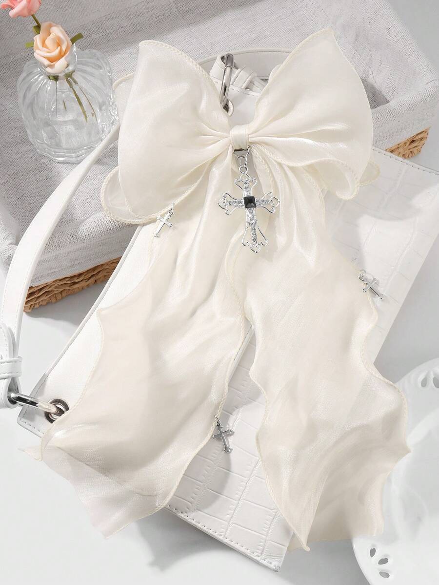 Kawaii 1pc Korean Style Elegant Versatile High-Quality Beige Mesh Double-Layered Bow, Crystal Cross Decor Hair Clip, Spring Clamp Hair Clip Suitable For Women & Girls, Daily Wear Or Holiday Gift