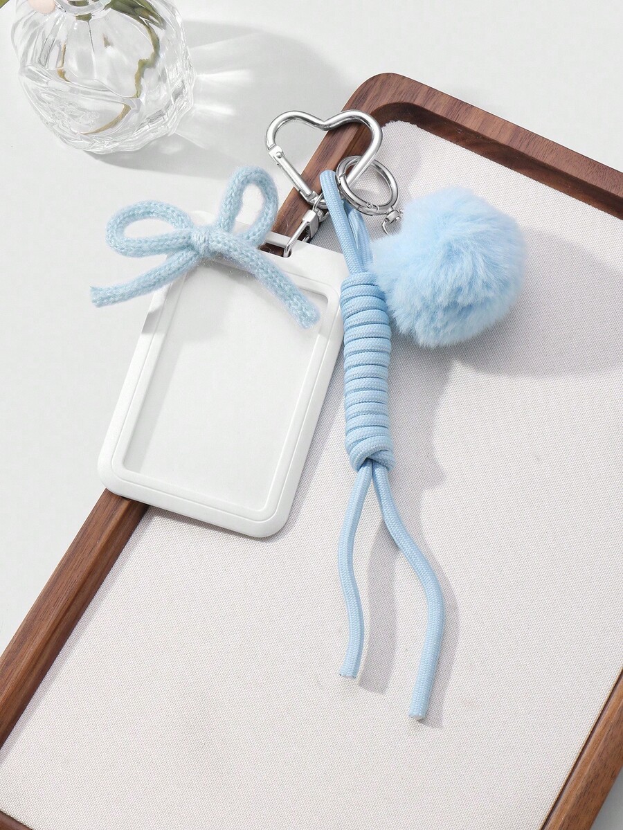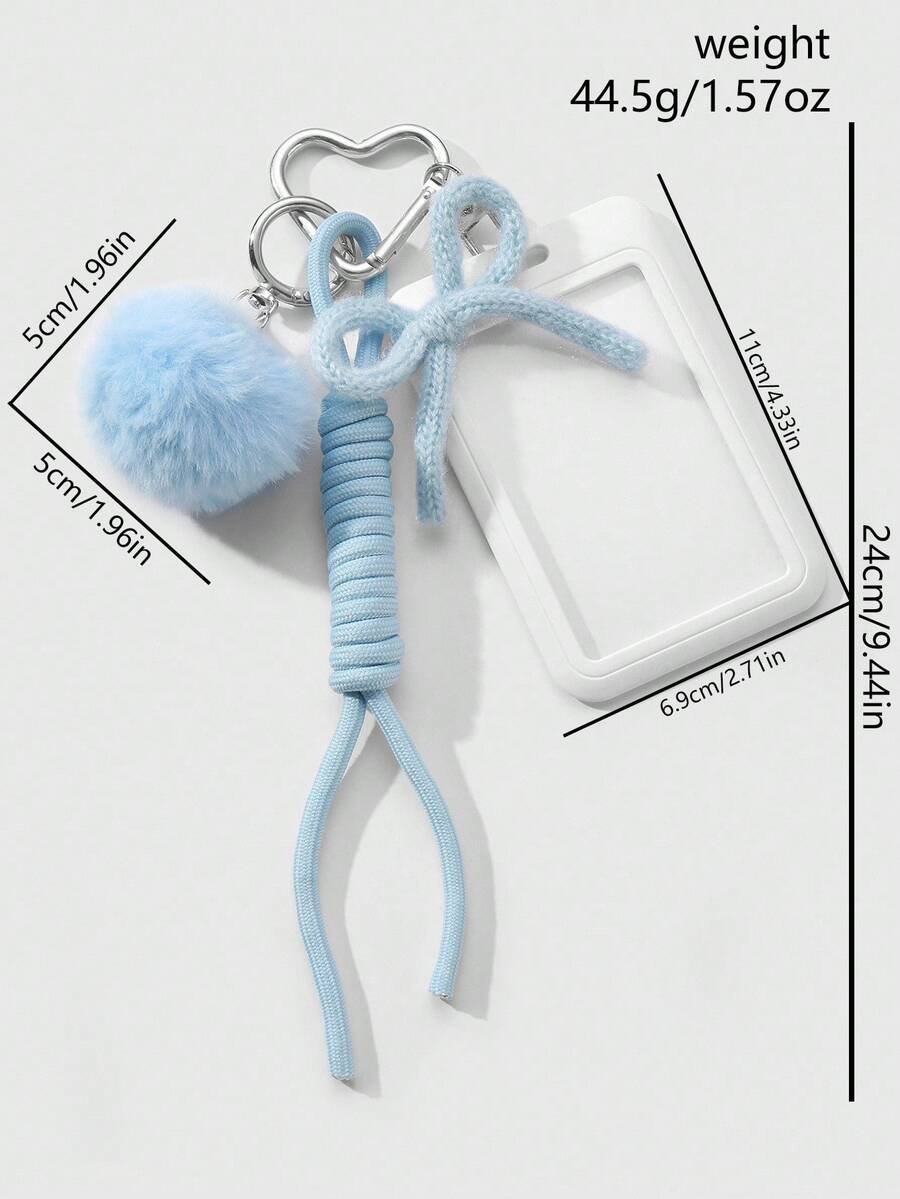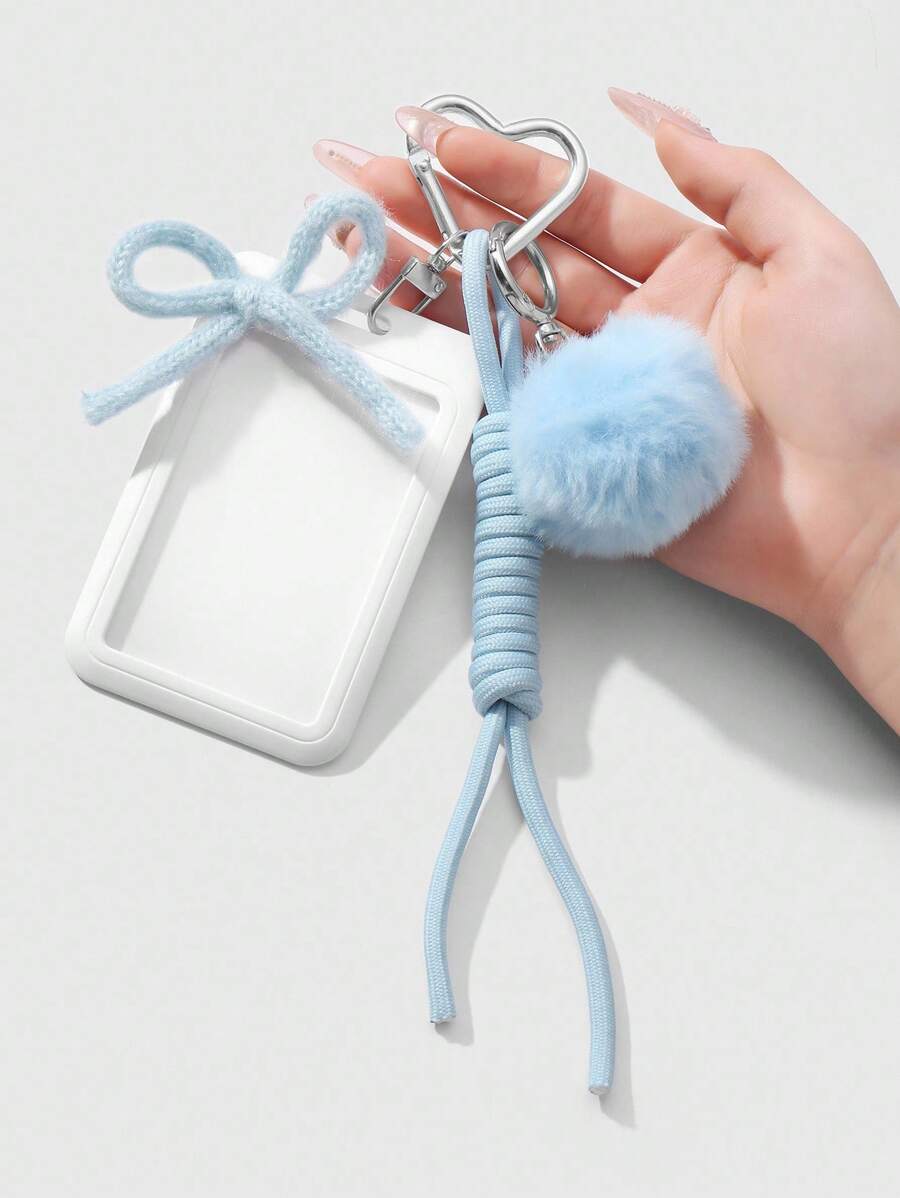 Kawaii 1pc Minimalist & Versatile High-Quality Blue Fuzzy Ball Bowknot Adjustable Braided Rope Acrylic ID Card Holder Keychain Bag Charm, Suitable For Office Workers, Students, Daily Wear, Holiday Gift