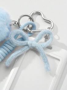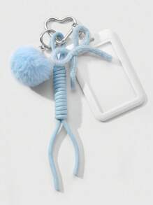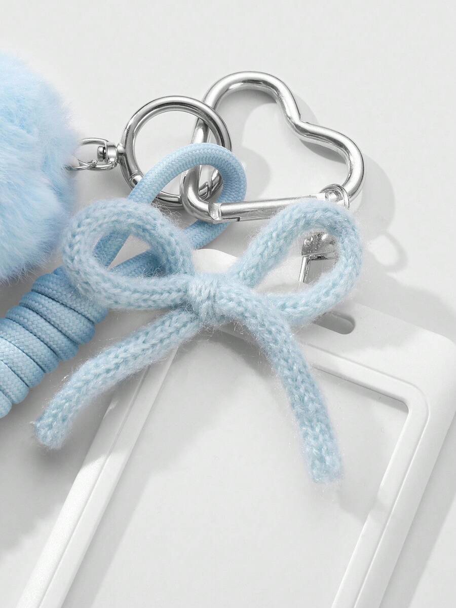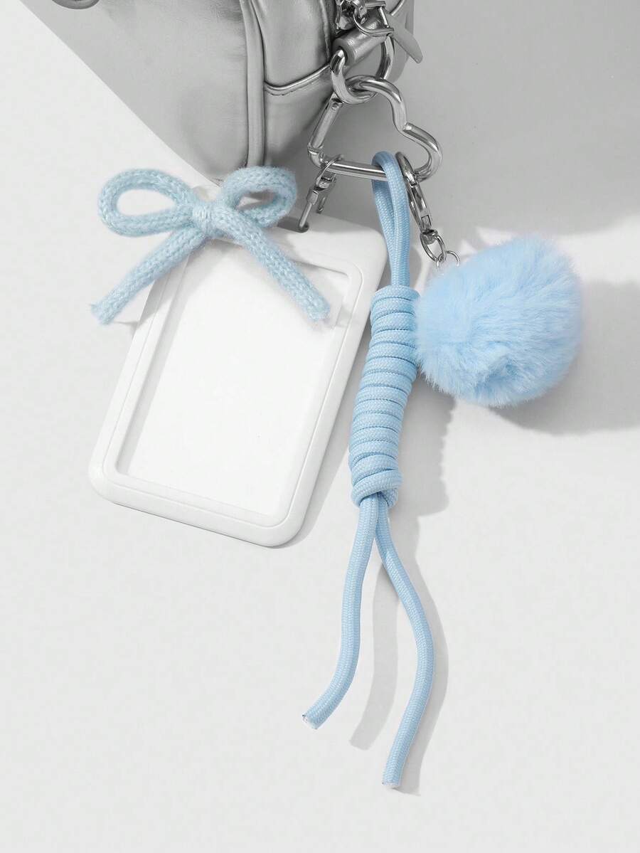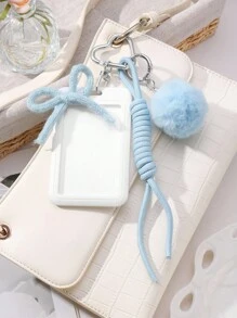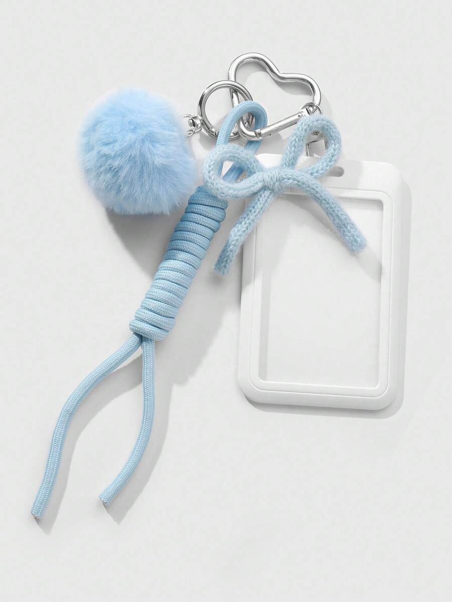 Kawaii 1pc Minimalist & Versatile High-Quality Blue Fuzzy Ball Bowknot Adjustable Braided Rope Acrylic ID Card Holder Keychain Bag Charm, Suitable For Office Workers, Students, Daily Wear, Holiday Gift
