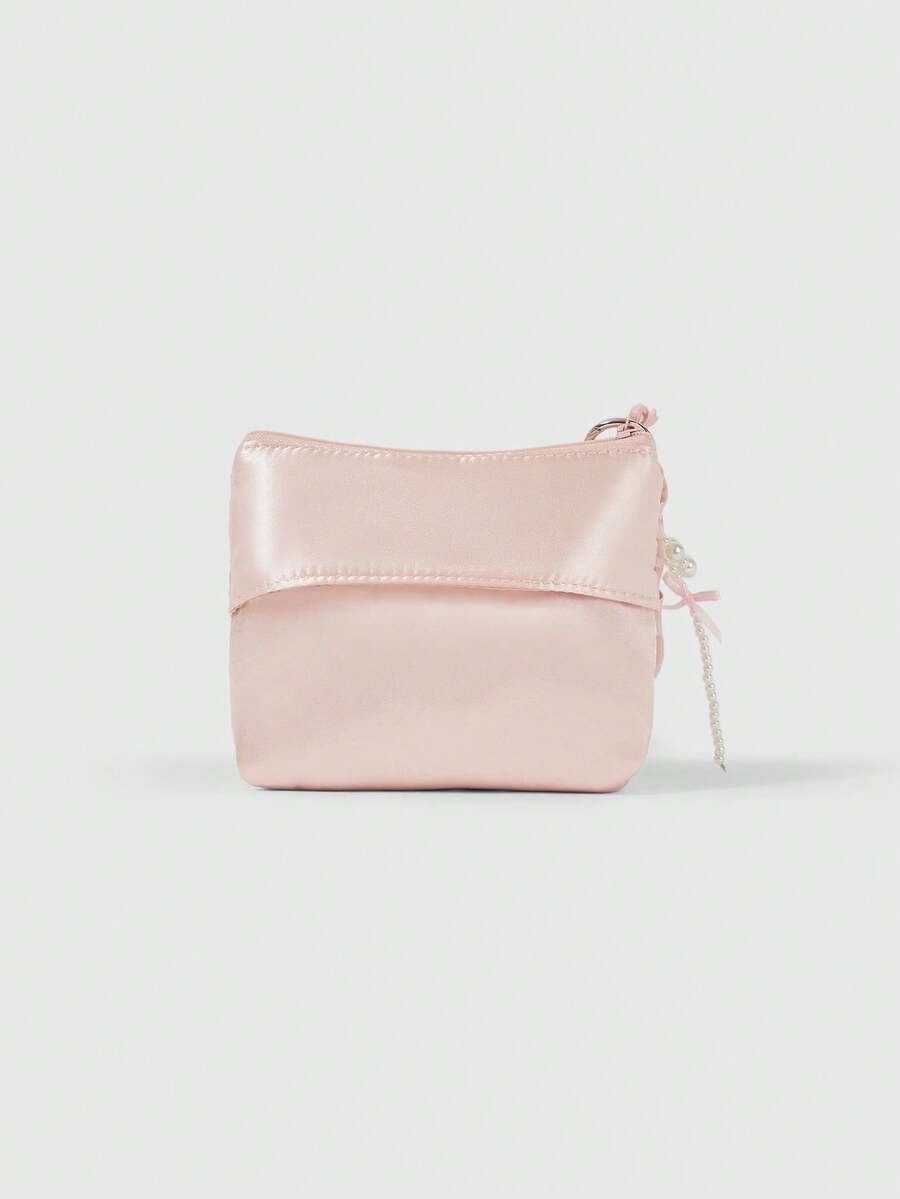 Kawaii 1pc Multi-Compartment Unique Design Embroidered Bow & Faux Pearl Decor Lace Edged Zipper Pink Makeup Bag, Sanitary Pad, Coin Purse, Can Hold Tissues - Gift For Mother
