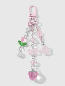 Kawaii 1pc Refined & Cute Girl Minimalist Academic Style Silver Chain Faux Pearl & Crystal Round Ball Stars Strawberry Bow Cartoon Phone Pendant Keychain Bag Charm, Suitable For Women, Daily Wear, Holiday Gift Valentines