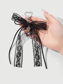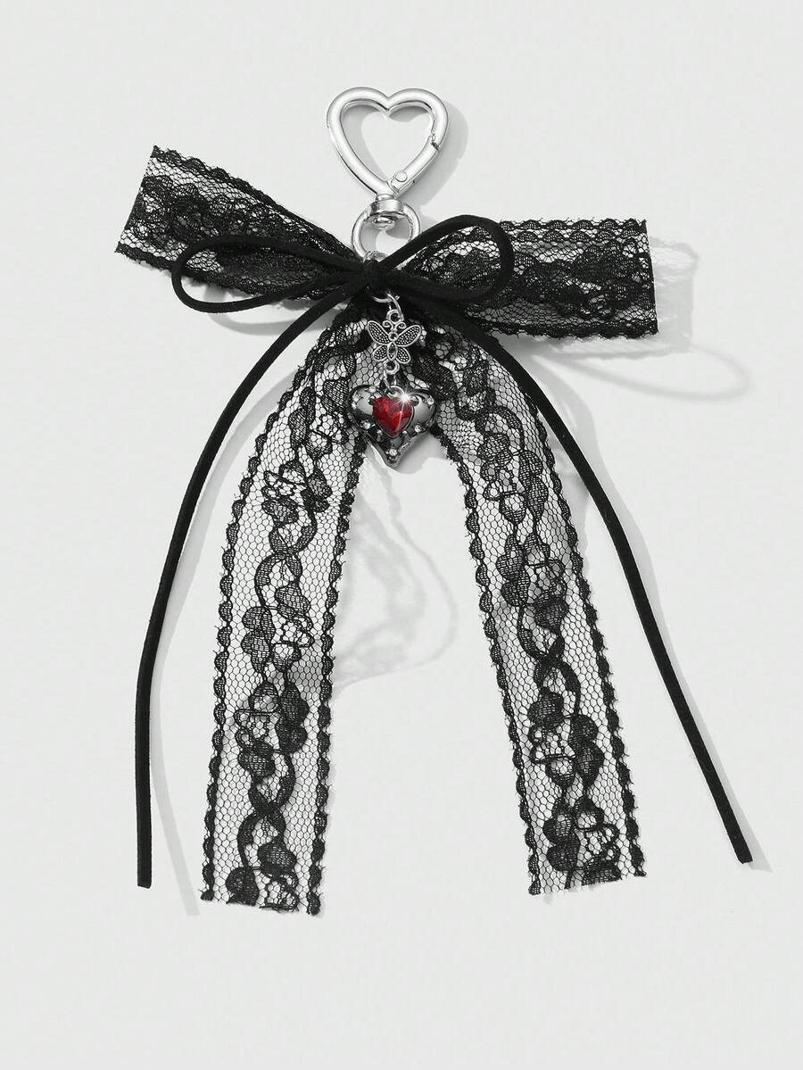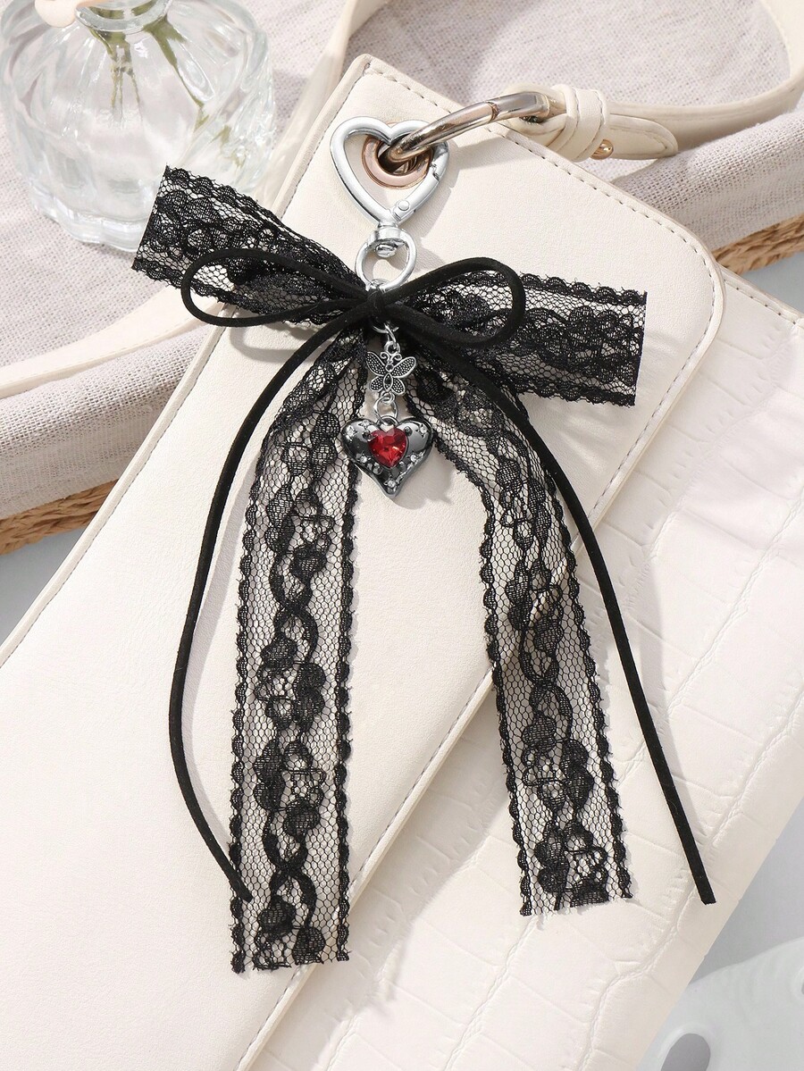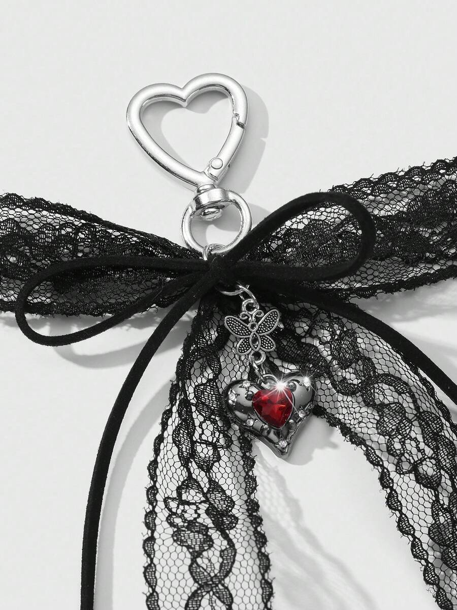 Kawaii 1pc Y2K Chic Vintage Goth Style Black Velvet Ribbon, Lace Trim, Bowknot, Faux Crystal Heart Shaped DIY Keychain, Purse Charm - Suitable For Women,Girls, Daily Wear, Holiday Gift