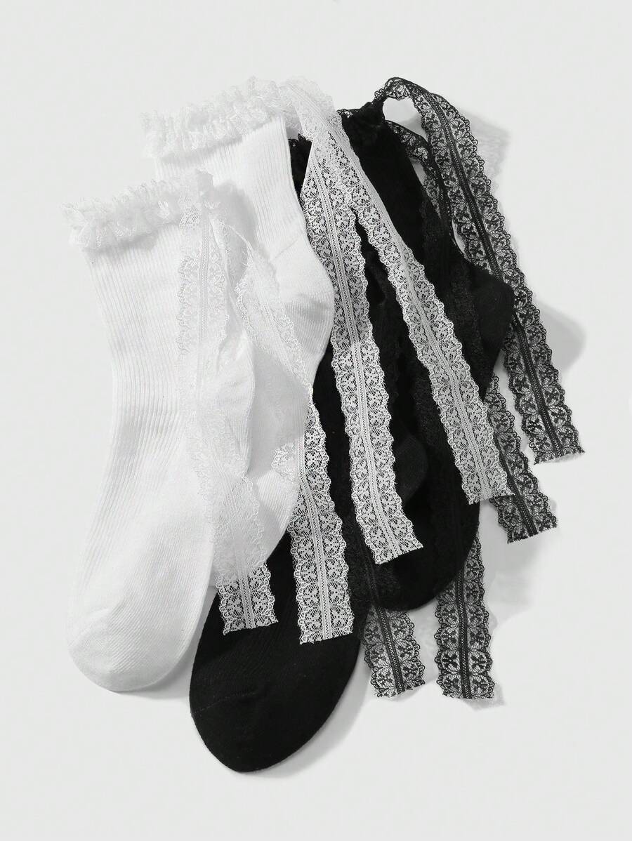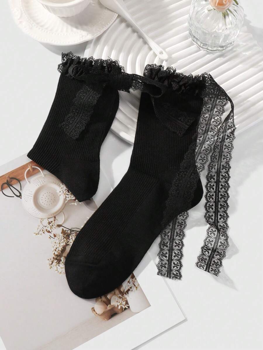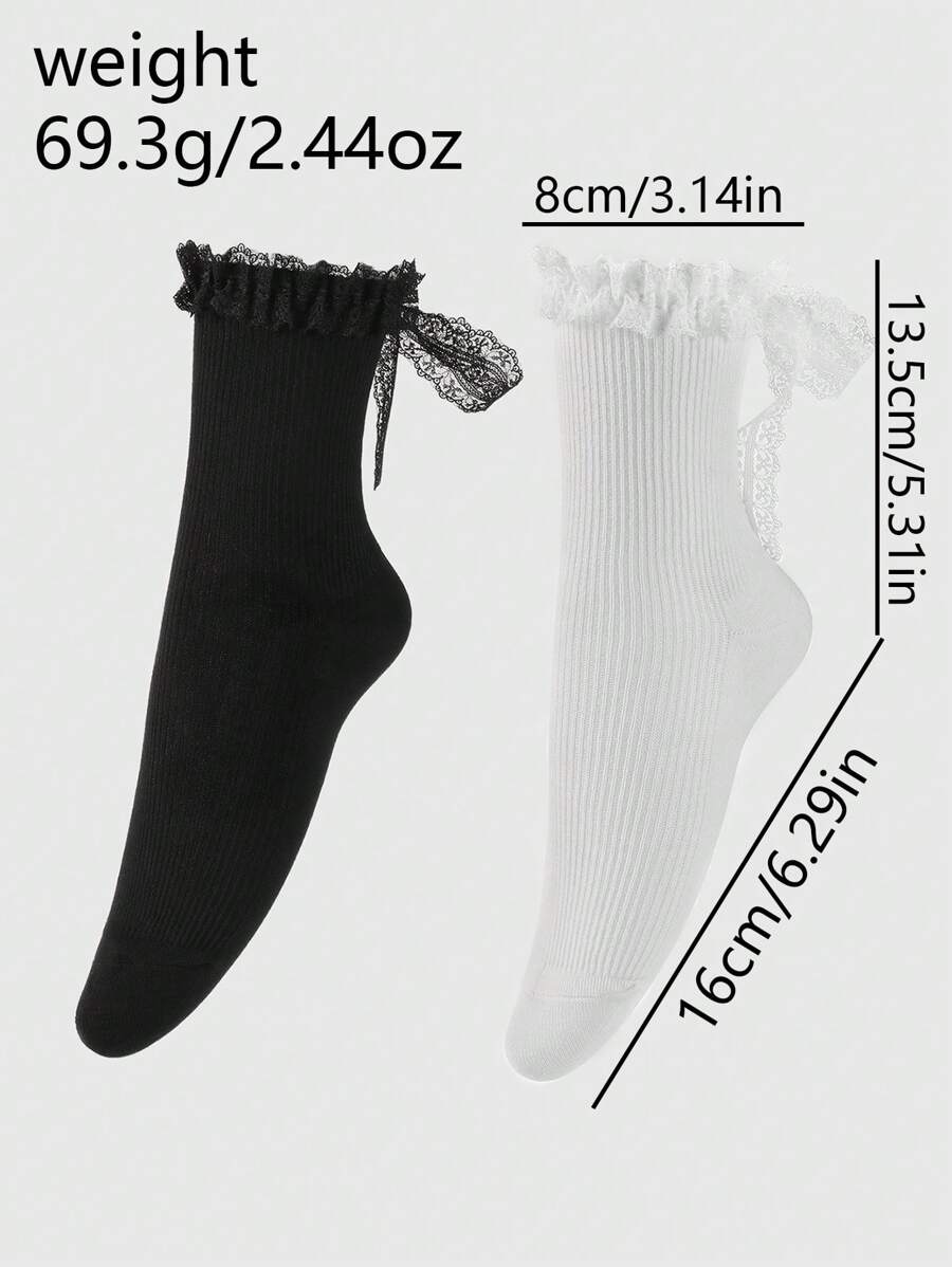 Kawaii 2 Pairs Ladies' Simple Solid Color Lace & Mesh Bow Mid-Calf Socks, Moisture Wicking & Thermal Insulation, Versatile & Fashionable Ruffle Socks, Suitable For Daily Wear, Gift Box Packaging