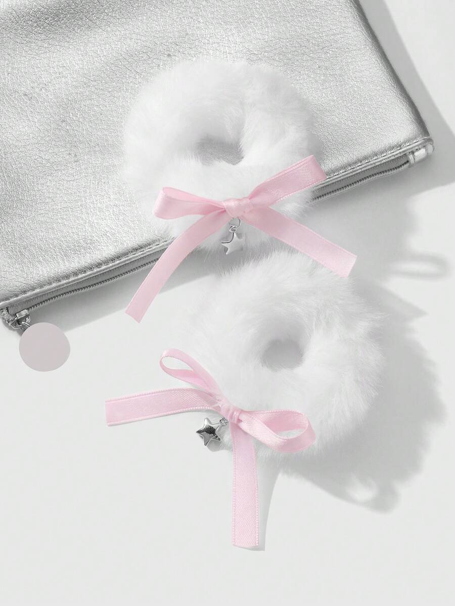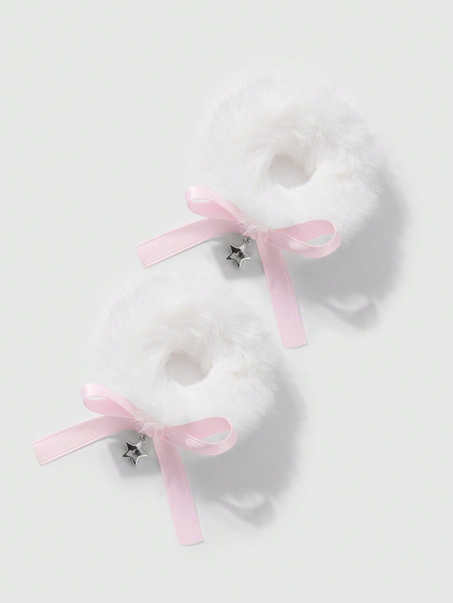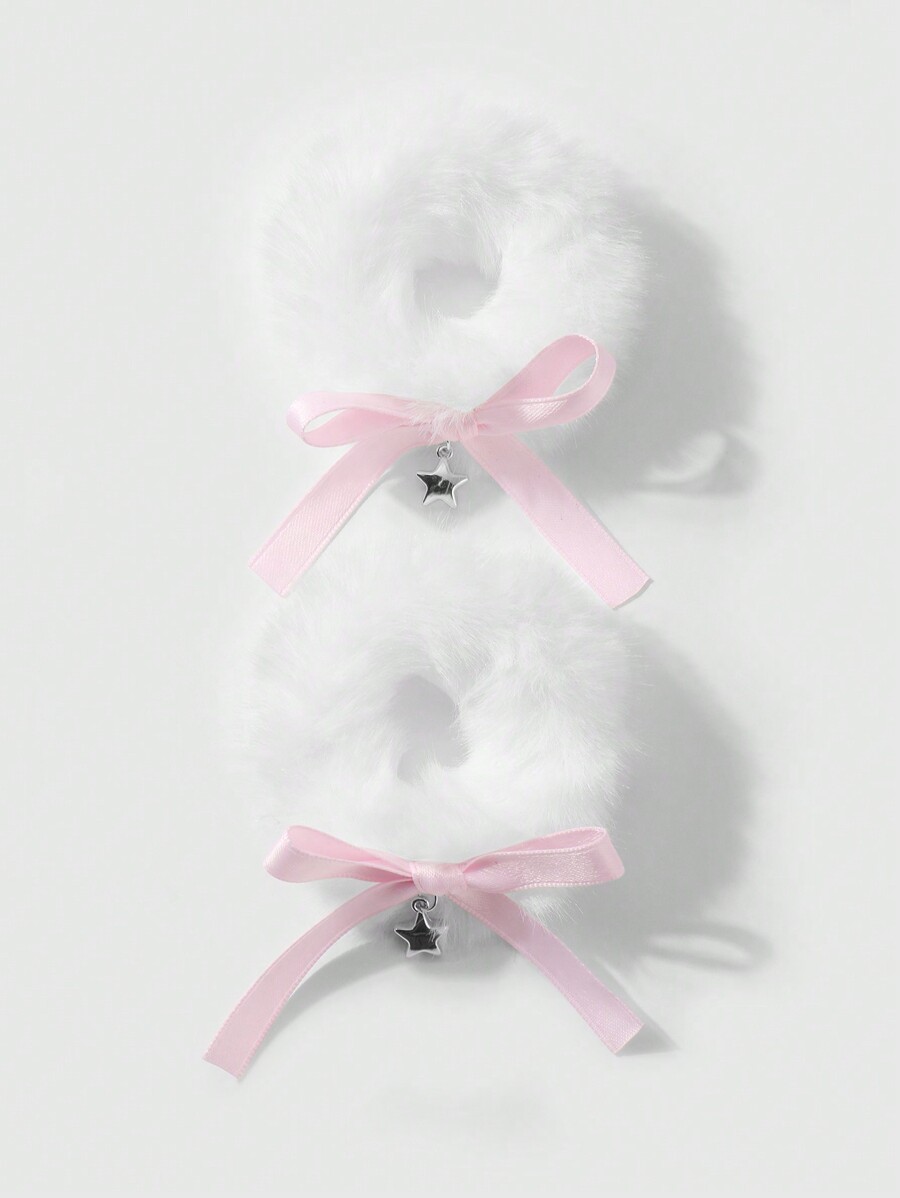 Kawaii 2 Pcs Korean Style Minimalist Cute Versatile High-Quality White Fluffy Hair Scrunchies Set With Bow & Star Charms, Suitable For Women & Girls Daily Use, Holiday Gift