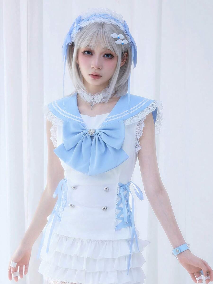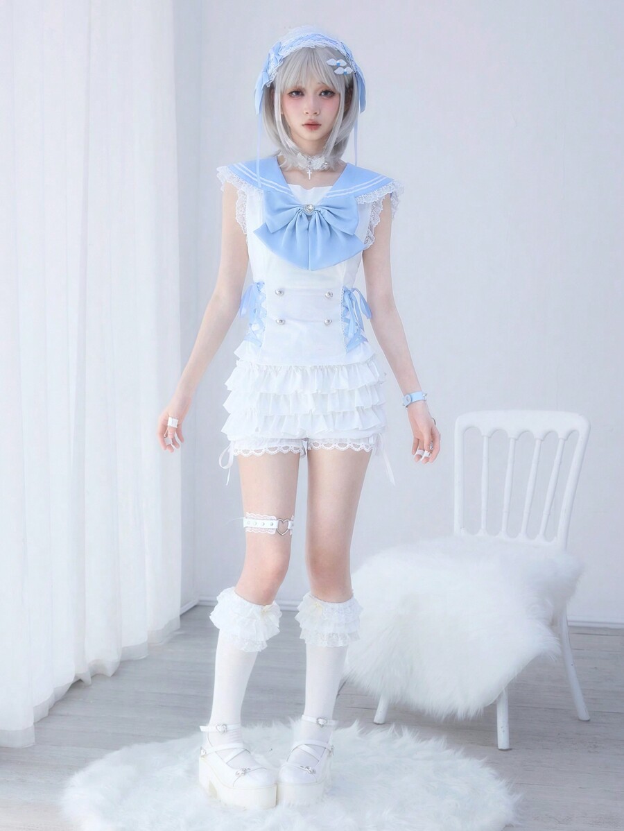 Kawaii 2 Pieces Anime Medical-Themed Bow Ribbon Lace Trim Sailor Style Camisole For Women