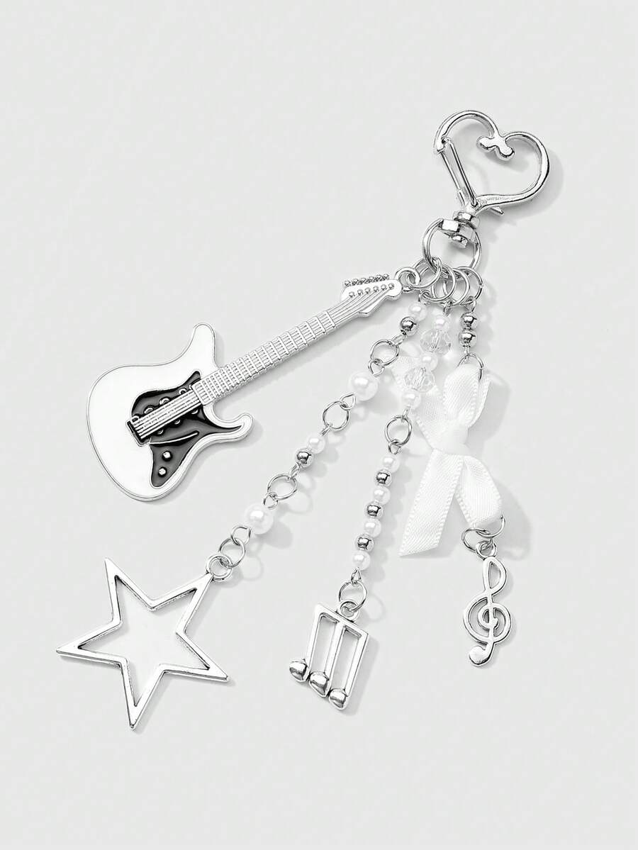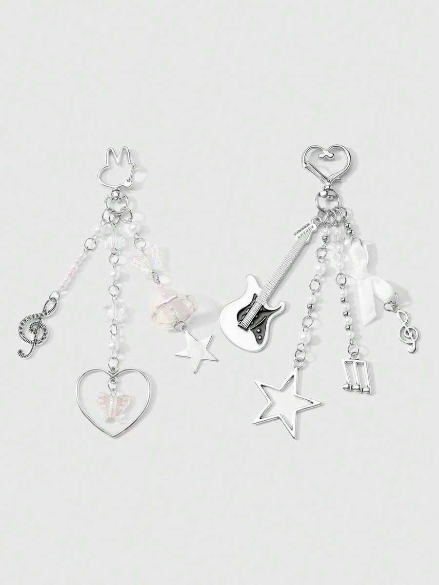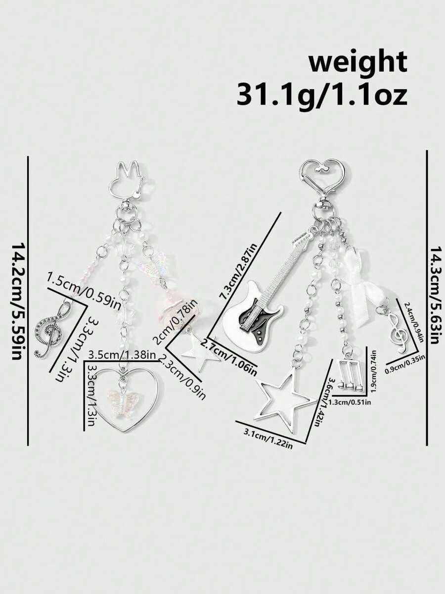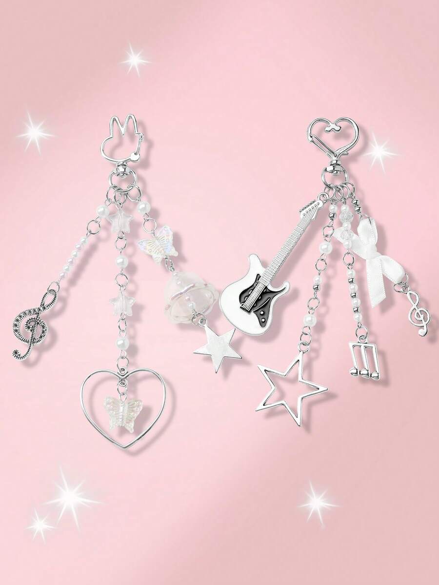 Kawaii 2pcs Fashionable & Versatile Silver Chain Faux Pearl Resin Star, Heart, Butterfly, Acrylic Wind Chime, Music Note, Bow Tie, Black & White Electric Guitar Pendant DIY Keychain, Bag Charm, Suitable For Sisters, Best Friends, Couples, Daily Wear, Holiday Gifts