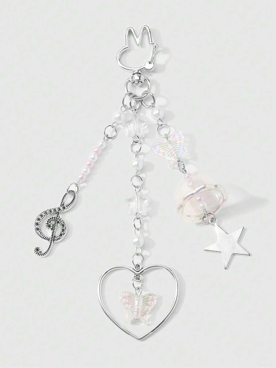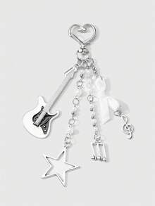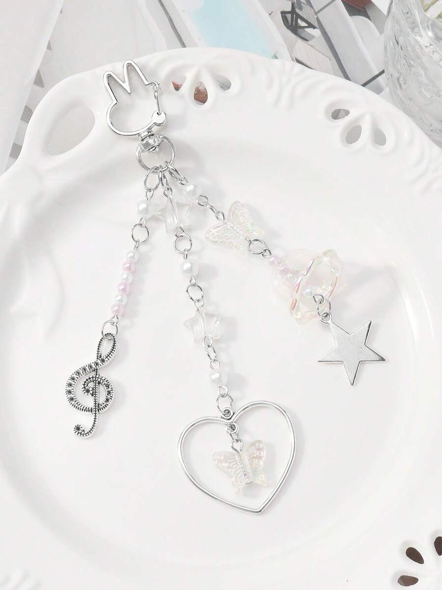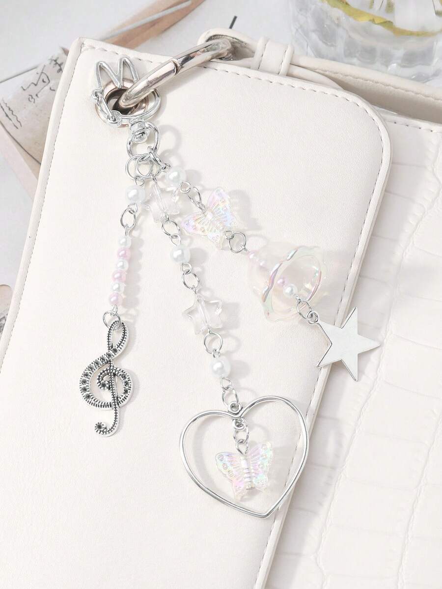 Kawaii 2pcs Fashionable & Versatile Silver Chain Faux Pearl Resin Star, Heart, Butterfly, Acrylic Wind Chime, Music Note, Bow Tie, Black & White Electric Guitar Pendant DIY Keychain, Bag Charm, Suitable For Sisters, Best Friends, Couples, Daily Wear, Holiday Gifts
