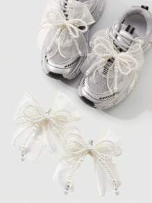 Kawaii 2pcs Korean Style Minimalist Fashion Handmade Beaded White Faux Pearl, Yellow Mesh Double Layered Bow, Star Pendant Shoe Decorations Combo Set, Suitable For Women, Daily Wear Or Gift