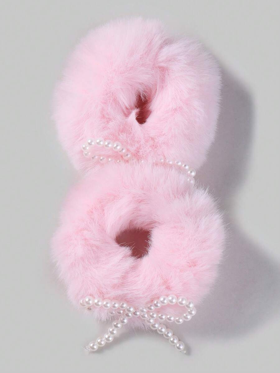 Kawaii 2pcs/Set Korean Style Elegant Cute Fashion Versatile Handmade Pearl & Plush Bow Hair Scrunchies, Suitable For Women & Girls Everyday Wear, Holiday Gift