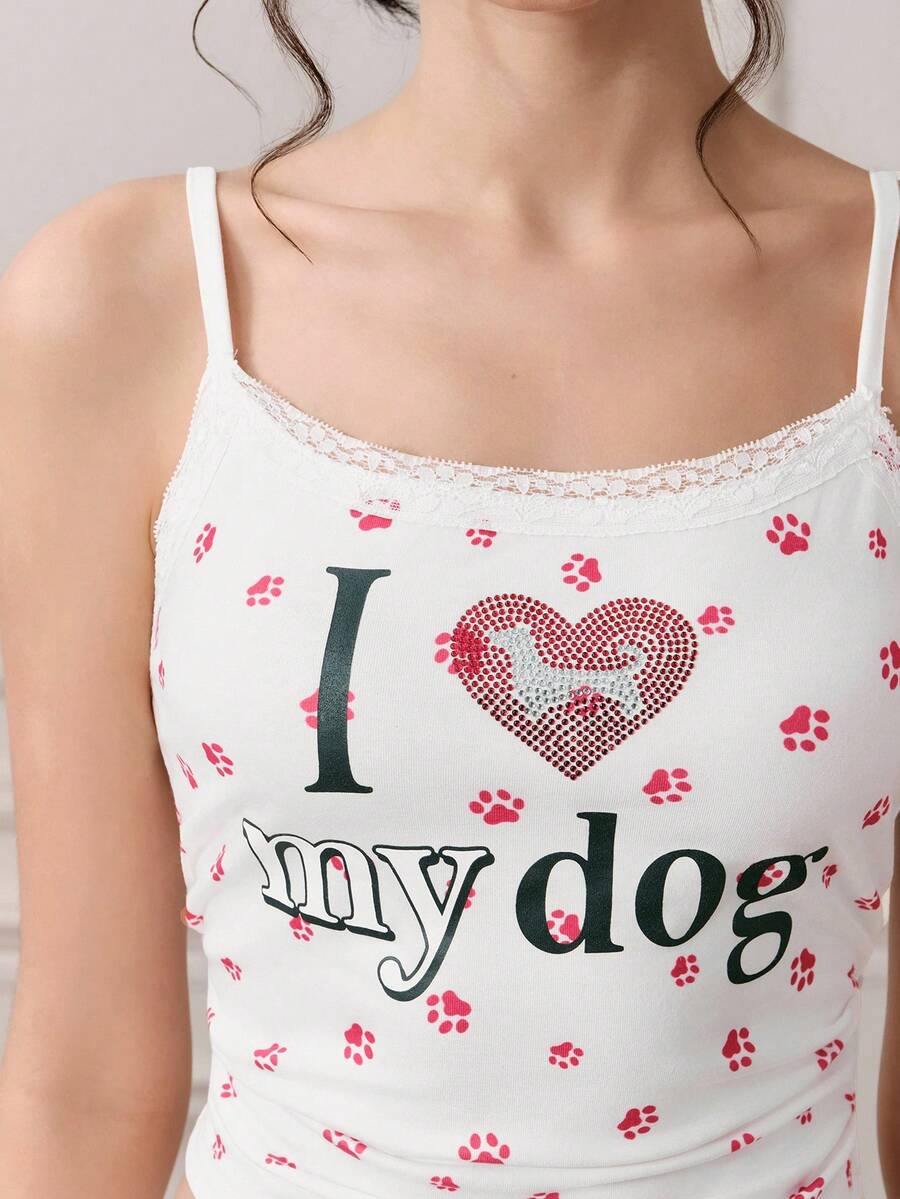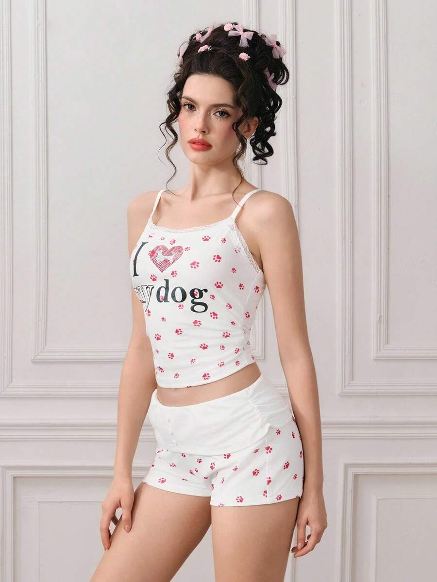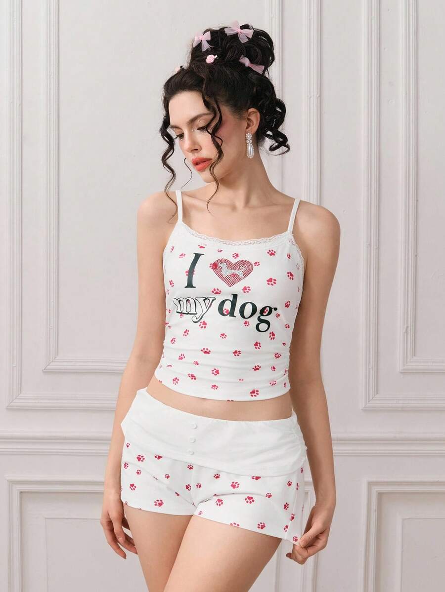 Kawaii 2pcs/Set Women Summer Letter & Heart Print Spaghetti Strap Vest And Shorts Set