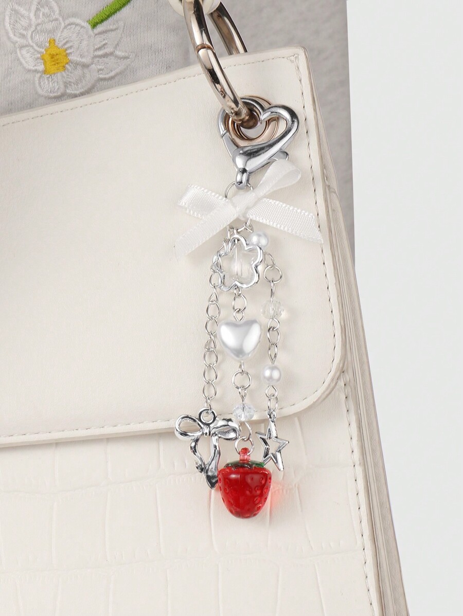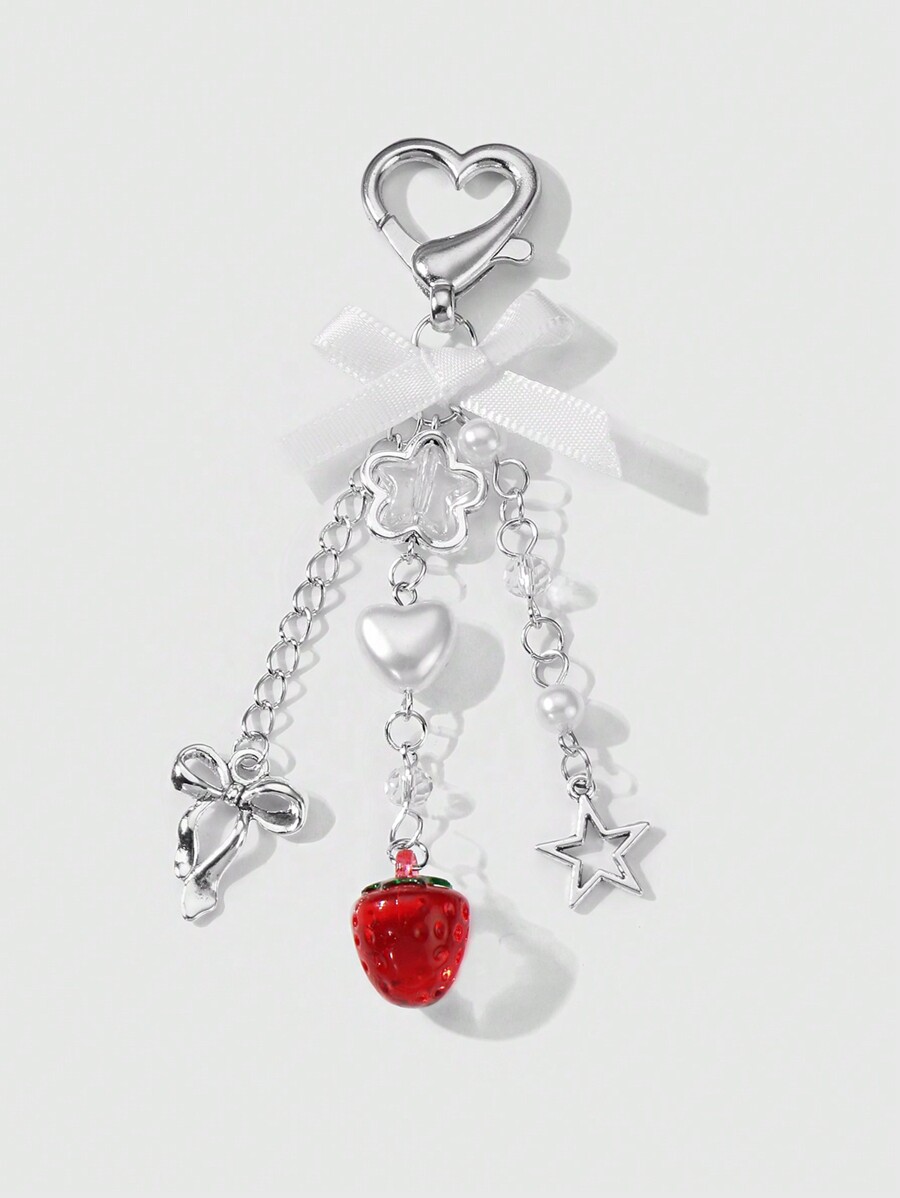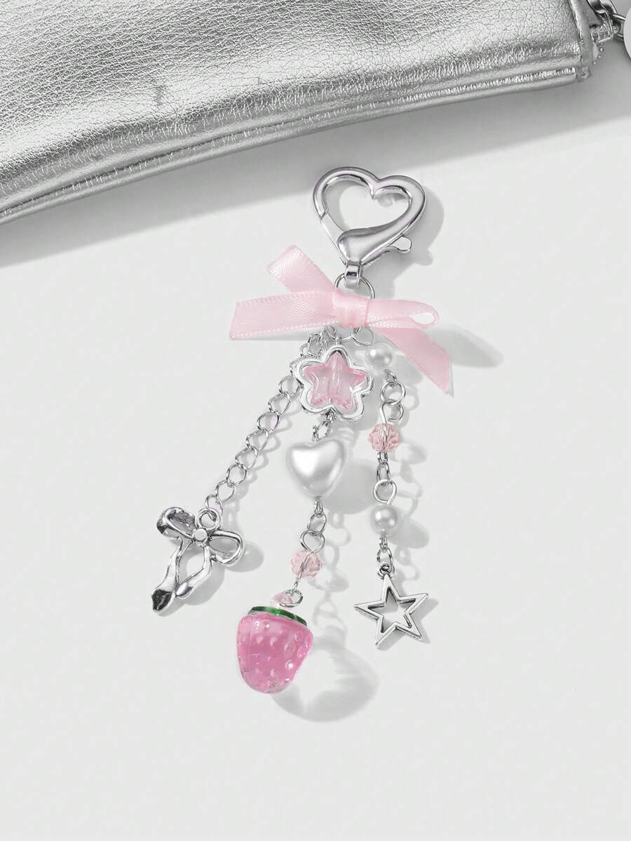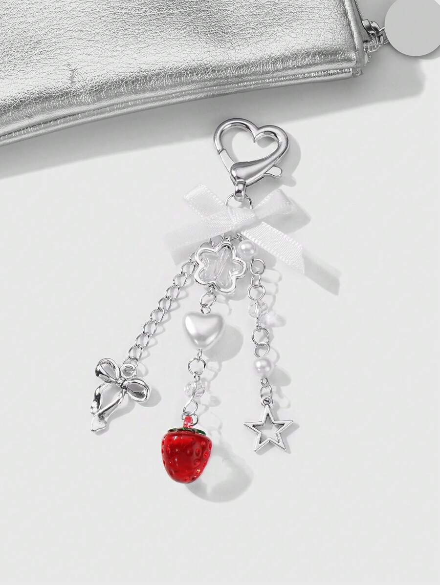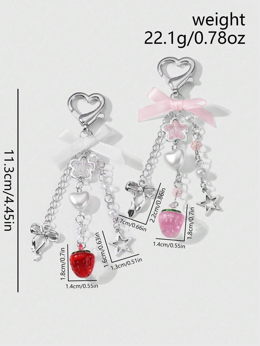 Kawaii 2pcs Y2K Delicate Fashion High-Quality Silver Chain Faux Pearl, Heart, Ribbon, Butterfly, Star, Strawberry Pendant Keychain Accessory Combo, Suitable For Sisters, Best Friends, Couples, Everyday Wear, Holiday Gift