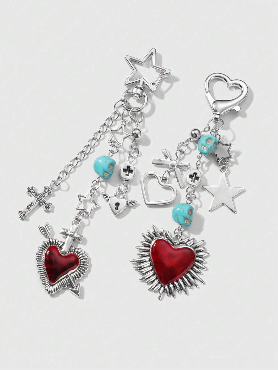Kawaii 2pcs Y2K Fashion Gothic Stylish Heart, Star, Cross, Skull, Arrow Pendant Keychain Bag Decor, Suitable For Women Daily Wear, Holiday Gift