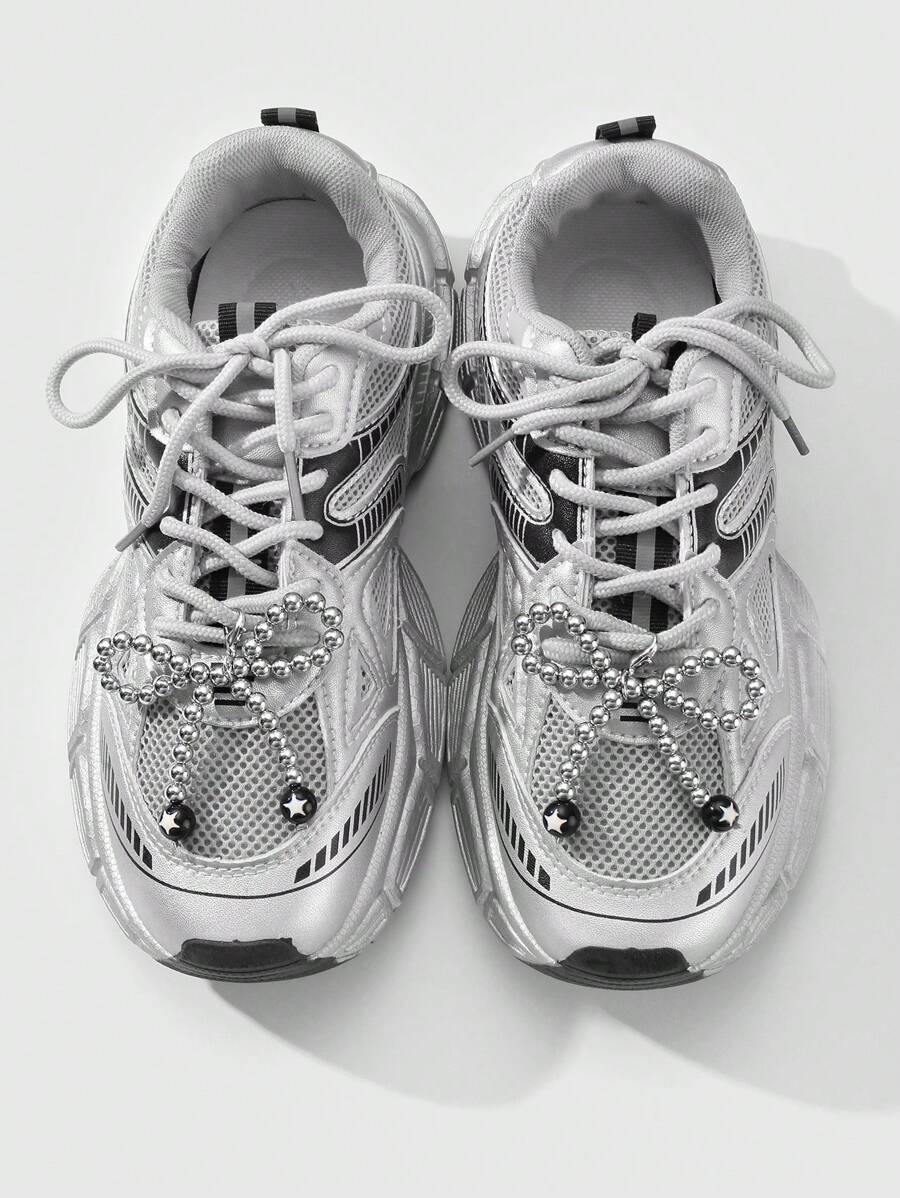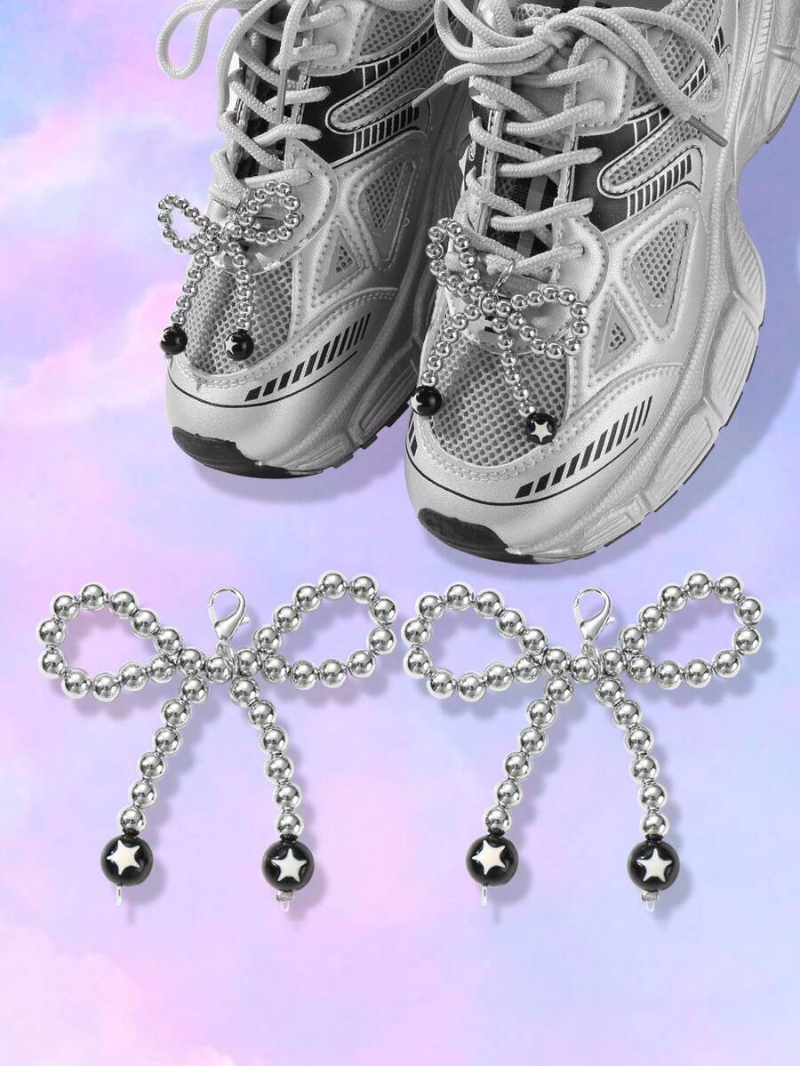Kawaii 2pcs Y2K Luxury Handmade Beaded Silver CCB Star & Bow DIY Shoe Clips/Charms, Fashion Simple Elegant Decor Accessories, Suitable For Women & Girls, Great Gift For Festivals
