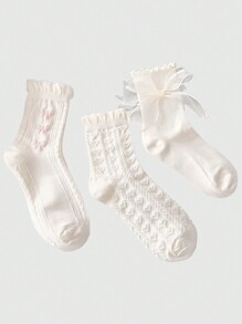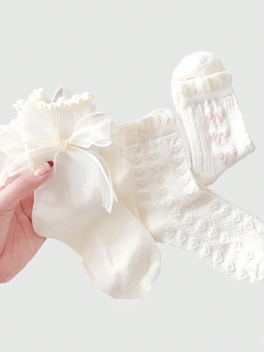 Kawaii 3 Pairs Ruffle Ribbon Heart & Bow Accent Solid Color Mid-Calf Socks For Women