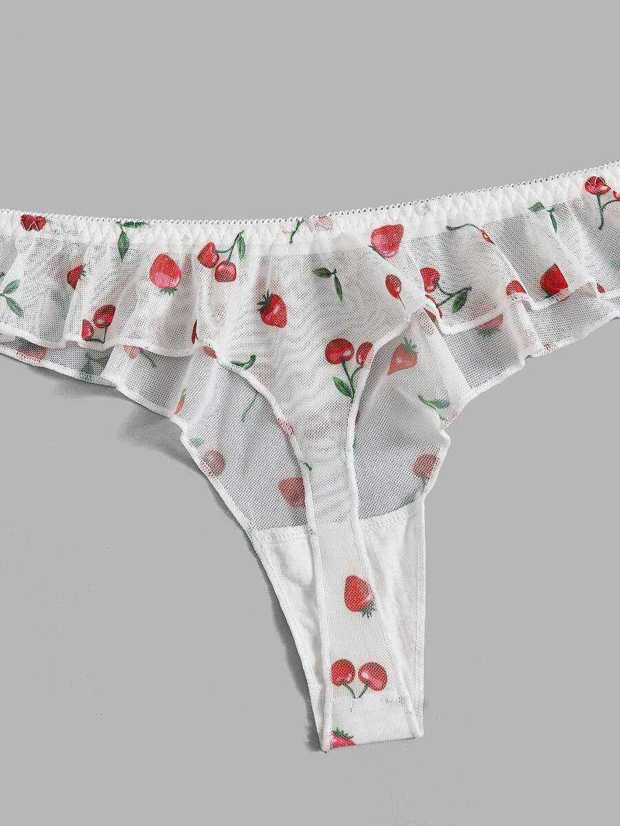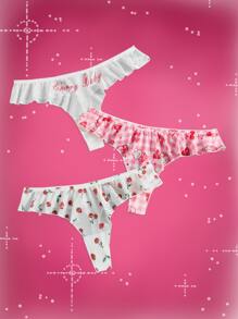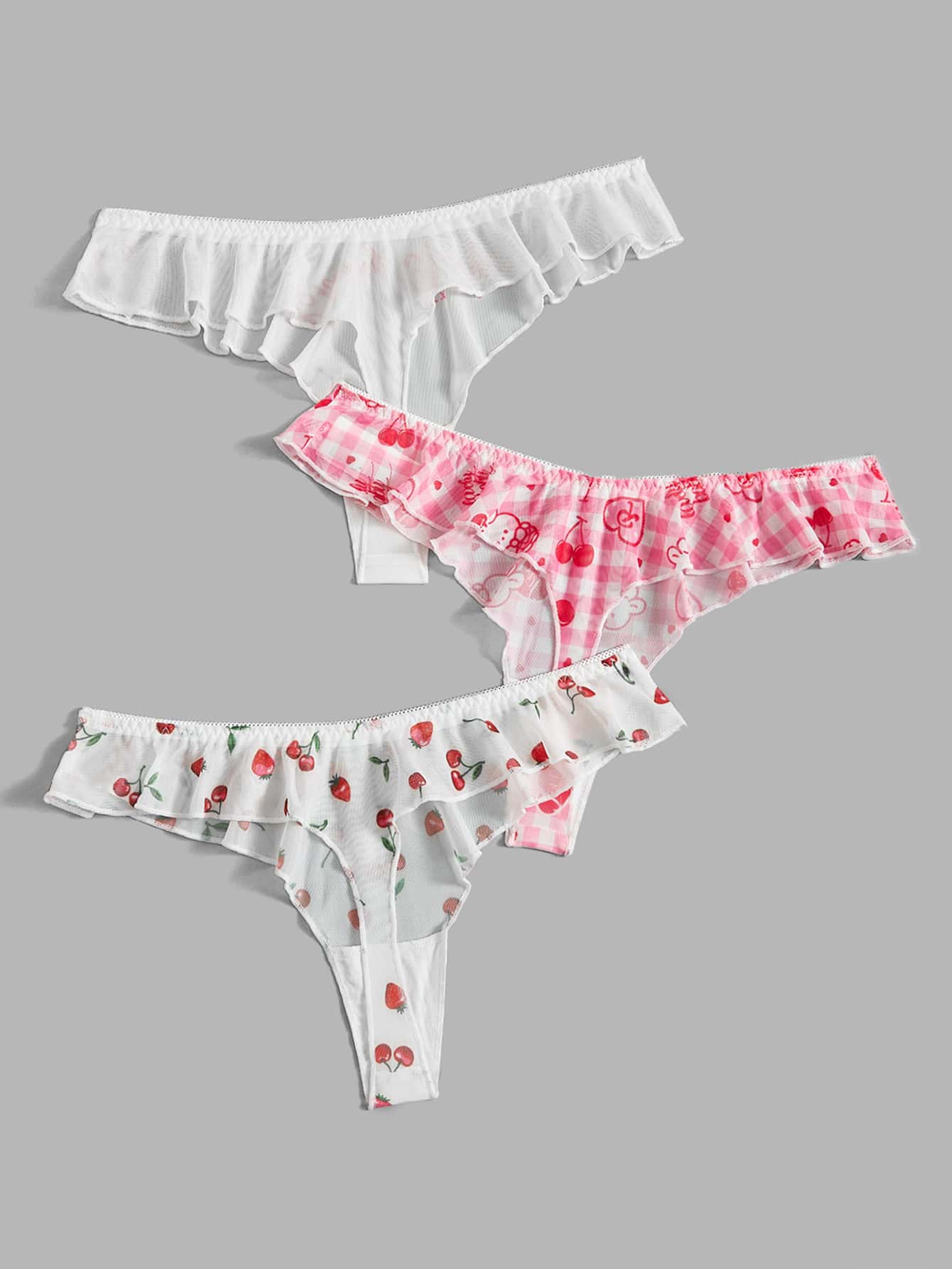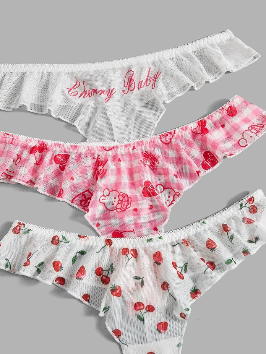 Kawaii 3pack Strawberry & Cartoon Print Contrast Lace Panty Set