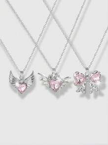 Kawaii 3pcs/Set European And American INS Style Pink Glass Rhinestone Inlaid Delicate Dynamic Bow Detail-Shaped Heart Pendant Necklace Set Valentines,Mom,Mother,Mother's Day,Gift