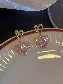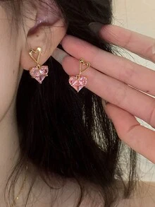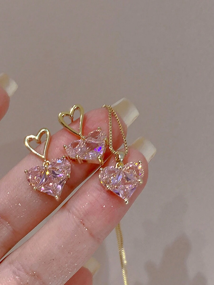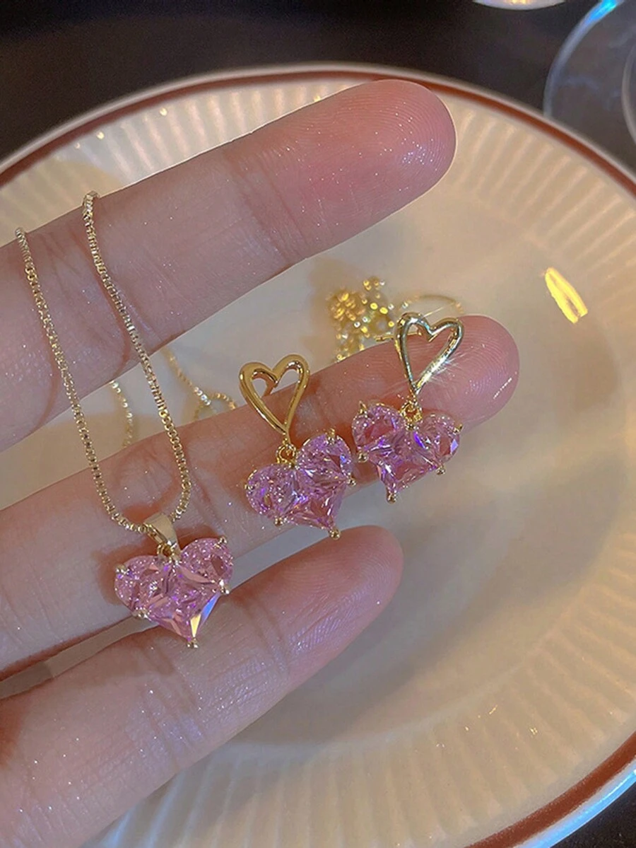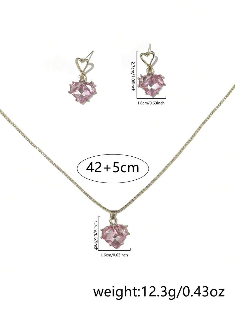 Kawaii 3pcs/Set Pink Rhinestone Inlaid Heart Shaped Dangle Earrings And Pendant Necklace For Women