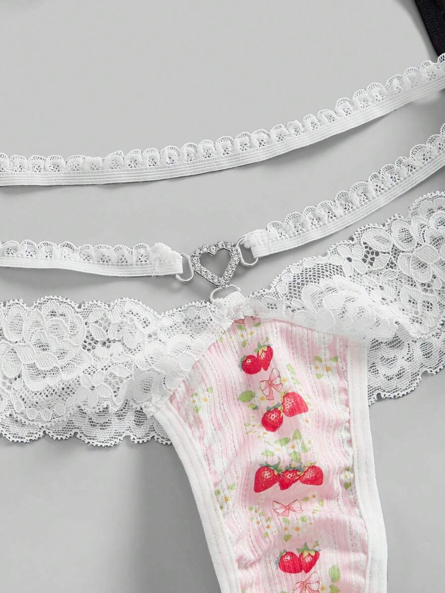 Kawaii 3pcs/Set Valentine's Day Strawberry Print Lace Patchwork Heart Metal Decor Women's Thong Panties