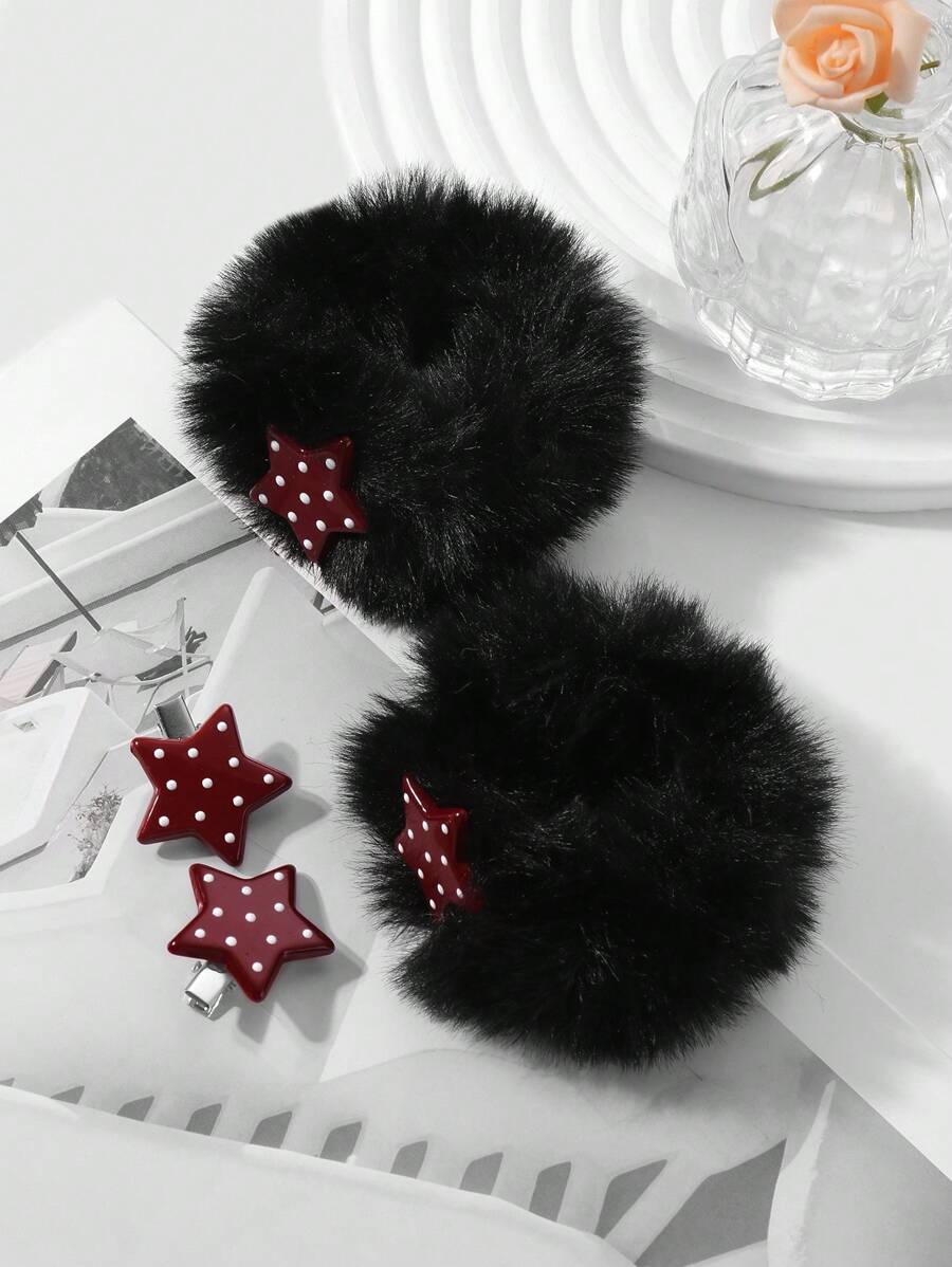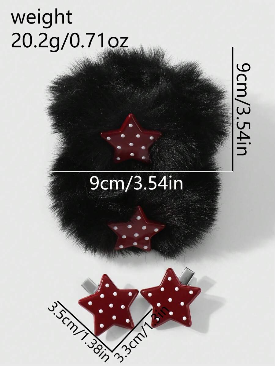 Kawaii 4pcs Gothic Style Fluffy Hair Scrunchies + Acrylic Ombre Star Hair Clips & Barrette Set, Fashion Accessories Gift For Women
