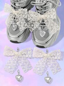Kawaii 4pcs Ins Minimalist Delicate Fashion High-Quality Beige Mesh Embroidery Bow + CCB Heart Shaped DIY Shoe Charms Decorative Set, Suitable For Women, Daily Wear, Holiday Gifts