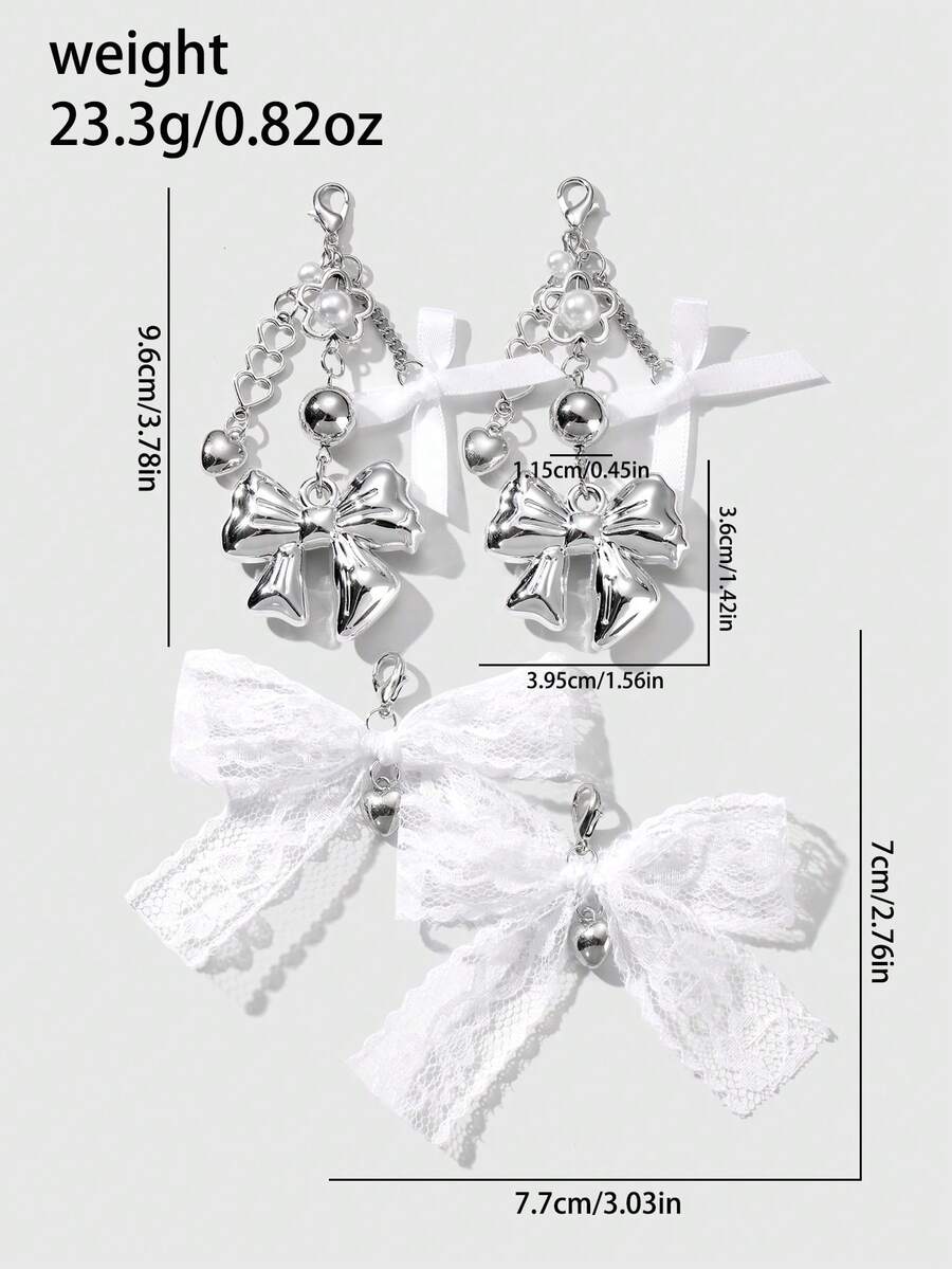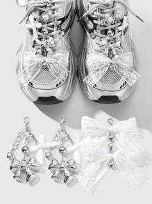 Kawaii 4pcs Stylish Hollow Silver Heart CCB Beads & White Lace Bow Shoe Buckle Decorations, Fashionable Versatile Accessories Suitable For Women, Great Gift Idea