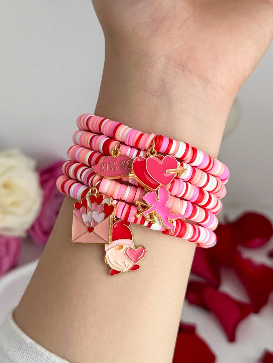 Kawaii 5pcs/Set Cute Pink Soft Clay Valentine's Day Bracelets, Handmade Stretchy Charm Bracelets With Y2K Style Angel Heart Pendant, Gift For Friends And Holidays