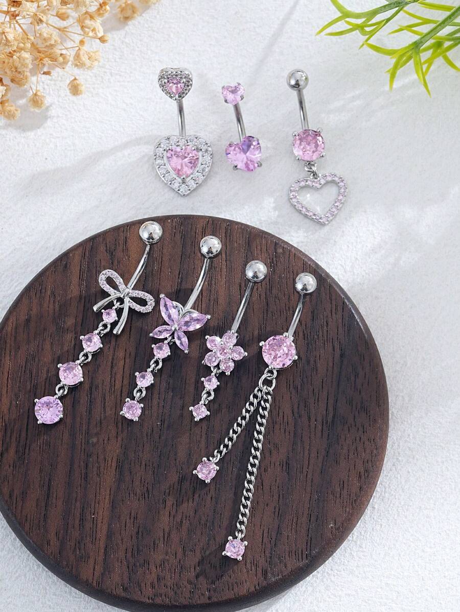 Kawaii 7 PCS Pink Butterfly, Flower, Heart Shaped Stainless Steel Navel Rings, Piercing Jewelry Suitable For Daily Wear