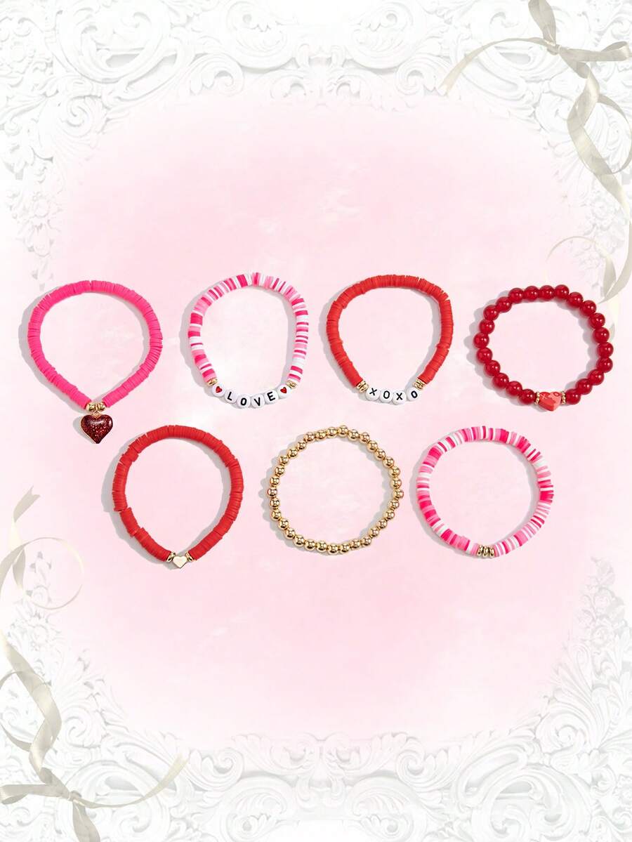 Kawaii 7pcs/Set Fashionable Sweet & Cute Heart Shaped Pendant & Beaded Alphabet Bracelet For Women Daily Wear, Valentine's Day & Friendship Gift,Mom,Mother,Mother's Day,Gift