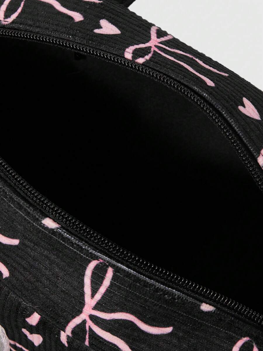 Kawaii Black Bow Corduroy Fashion Portable Bow & Heart Print Tote Bag For Women