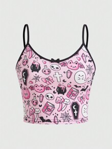 Kawaii Cartoon Graphic Contrast Binding Cami Top, School