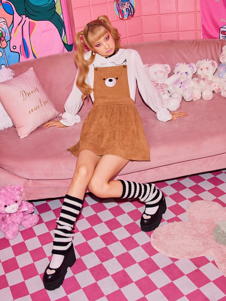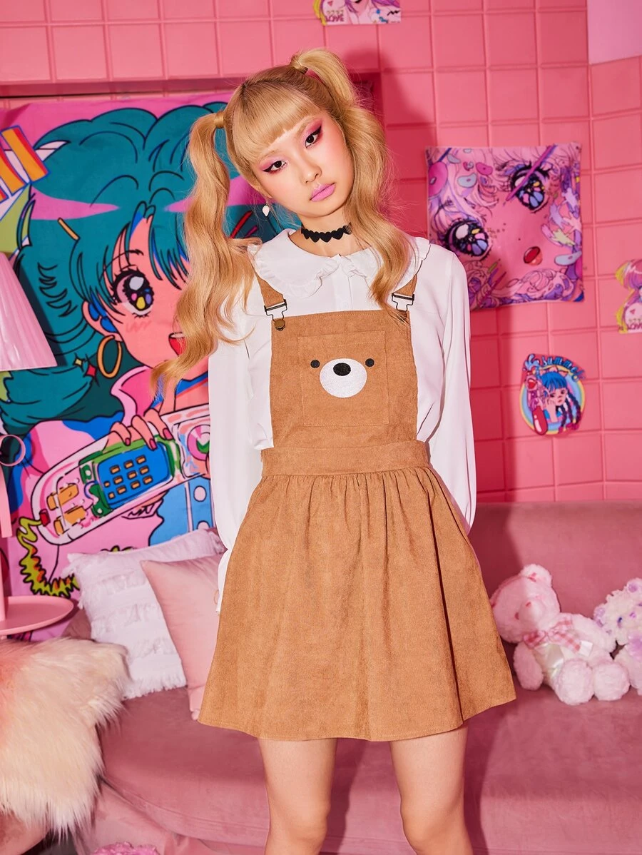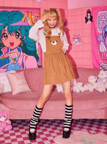 Kawaii Cartoon Graphic Corduroy Pocket Pinafore Dress
